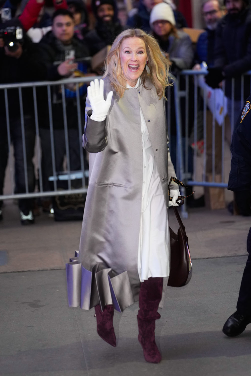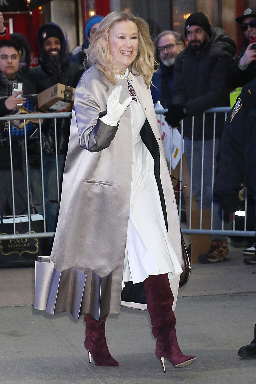 Speaking of coats though, we’re not done. Check out this grey goat with puffy pockets along the hem with the maroon suede boots. Catherine O’Hara can’t stop won’t stop.