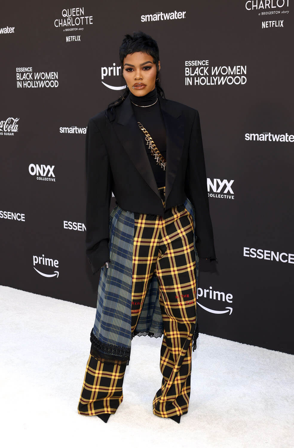 So Danielle won’t be at the Oscars on Sunday. But she’ll be everywhere else this weekend, and to go back to yesterday, she was honoured at the ESSENCE Black Women in Hollywood Award in a beautifully tailored black suit and I love the cut of these pants – a little baggy, high waist, under a slightly longer jacket, and this blouse! That collar, those chains around her neck, all of it framing her face so delicately … SO GOOD.