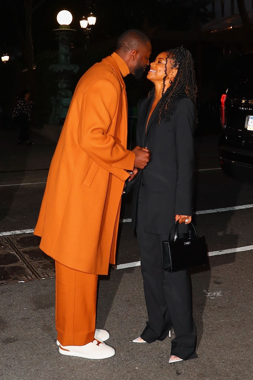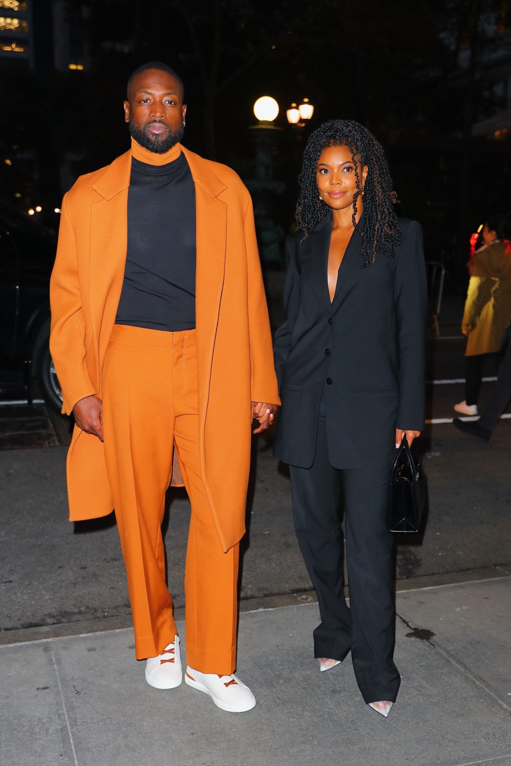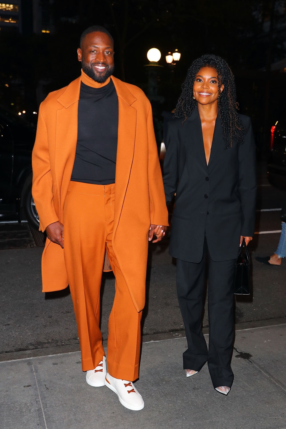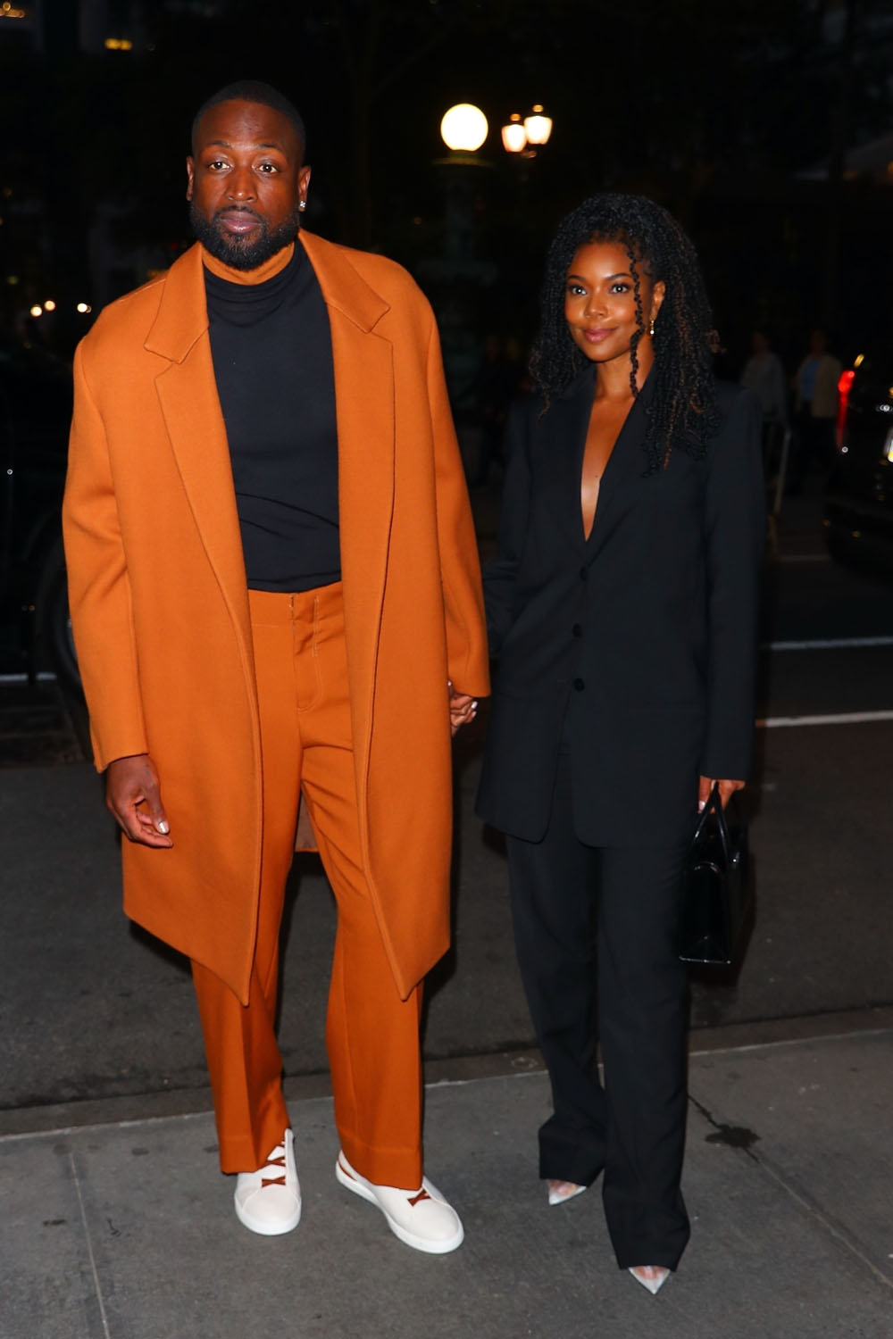 That was yesterday and later in the evening he and Gabrielle stepped out, both in suits to complement each other. Dwyane is great in a simple black tee under an orange set with a longer jacket. Gabby, too, is in a suit, hers is black, and her jacket is also longer. They’re great on their own but together, it’s a style duet, it’s excellent coordination without feeling like it’s too matchy-matchy.