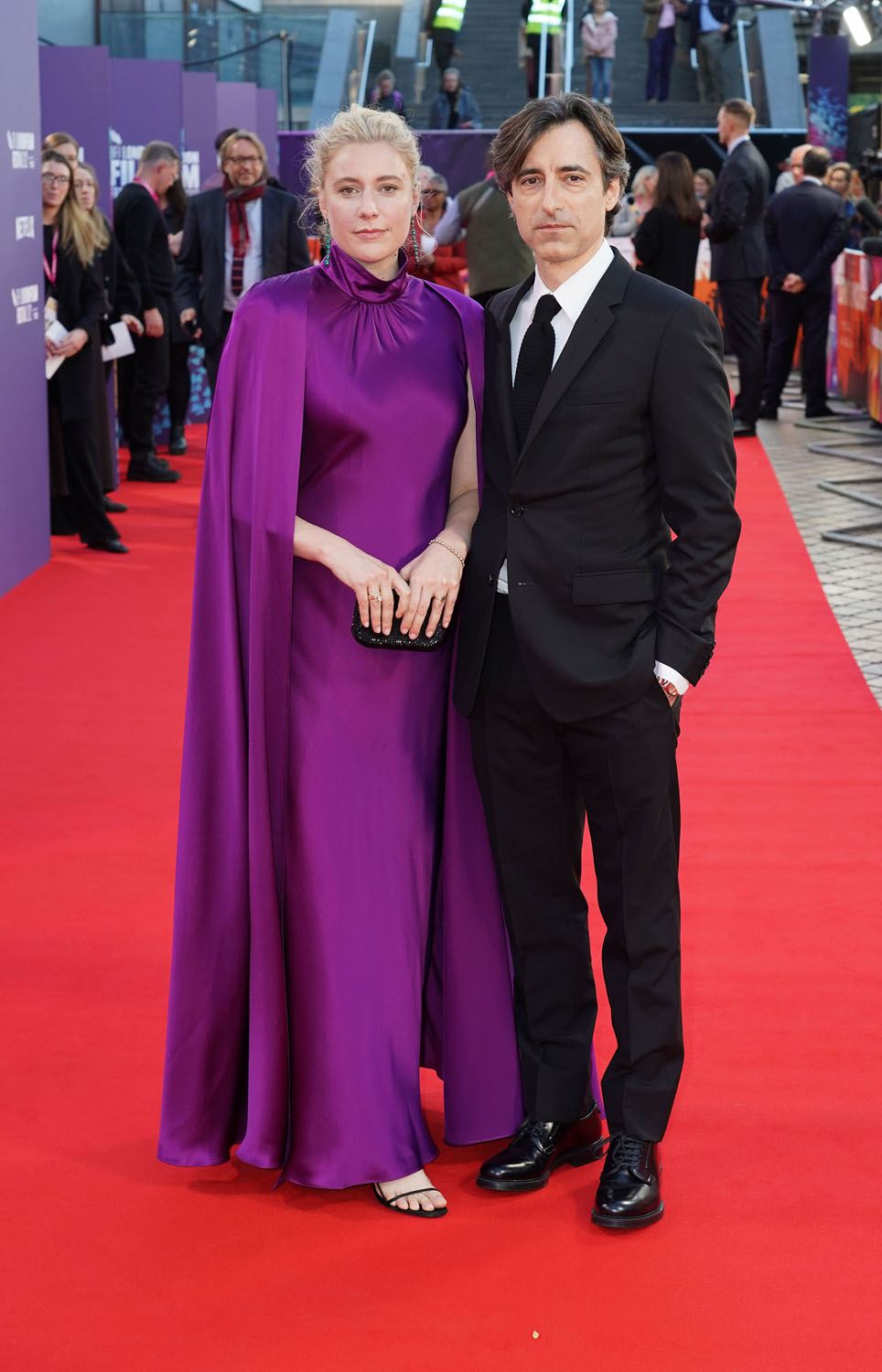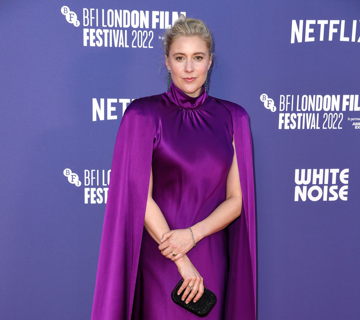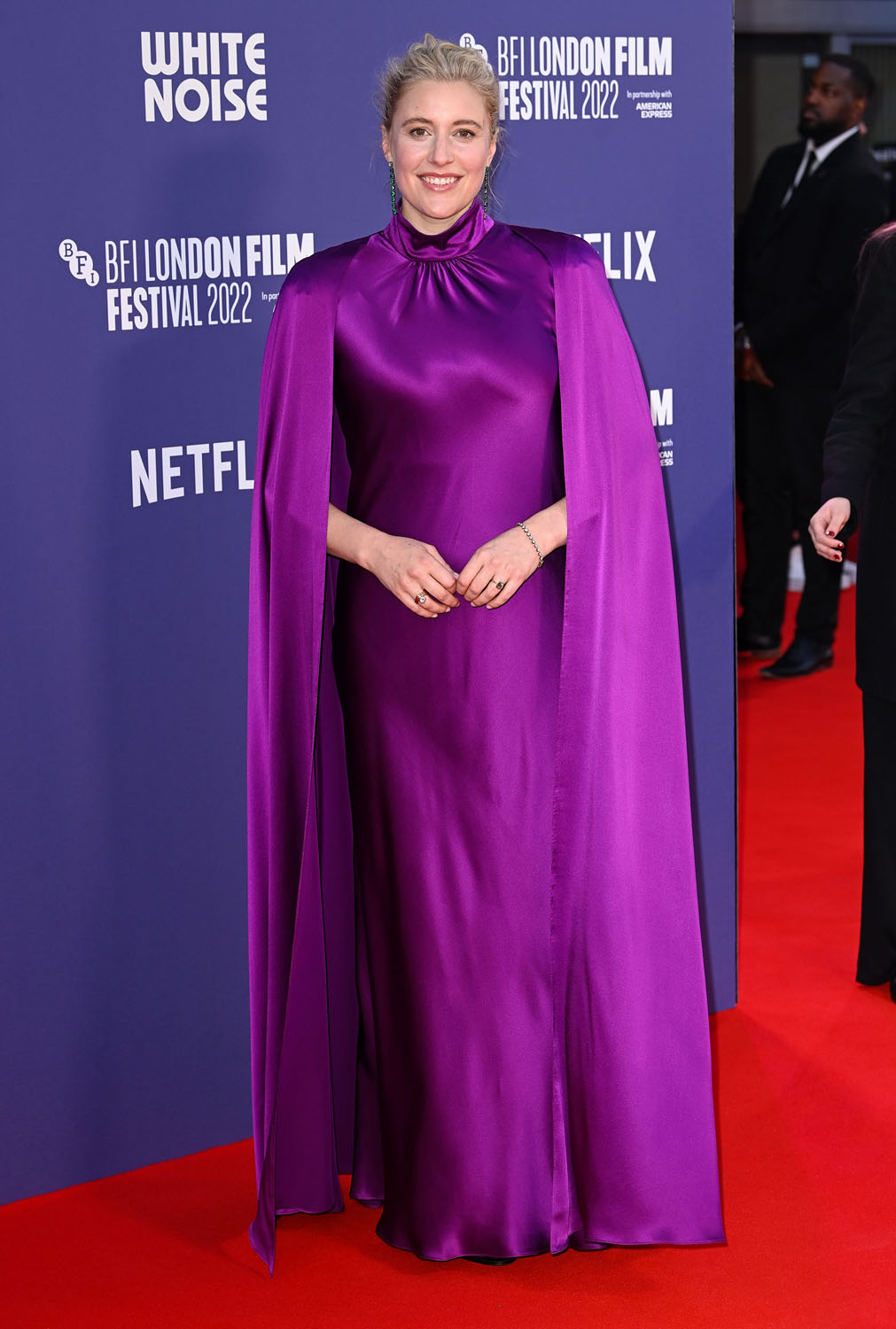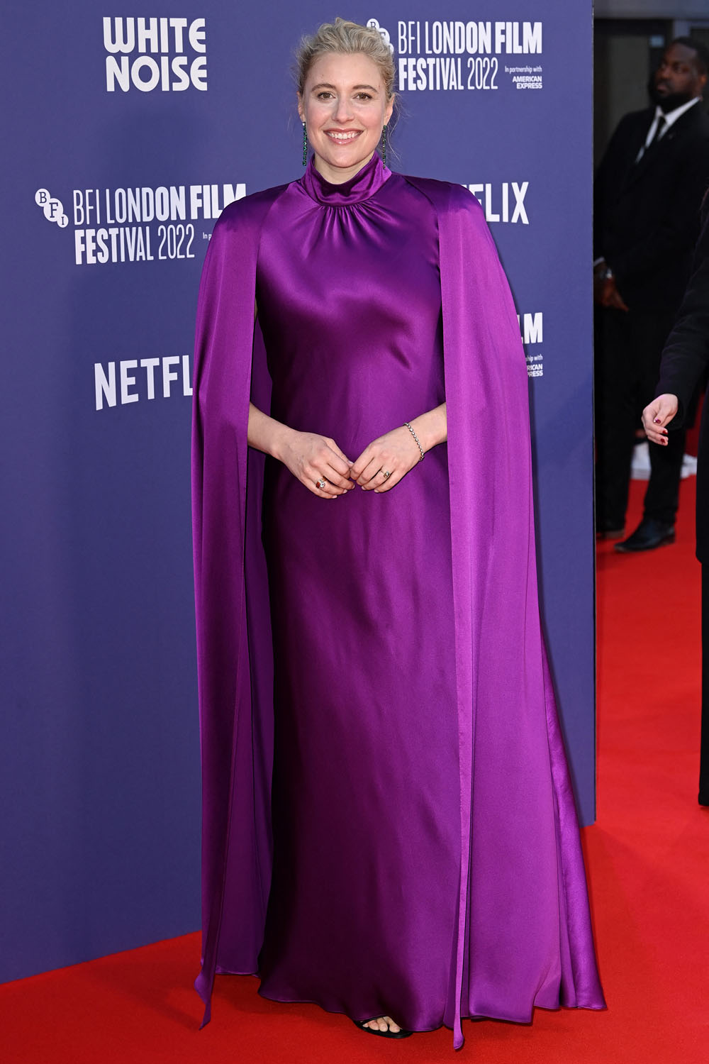 Also at the White Noise premiere – Greta Gerwig in a purple caped dress, one of the best outfits I’ve ever seen on her, and it’s a tricky material, too.
