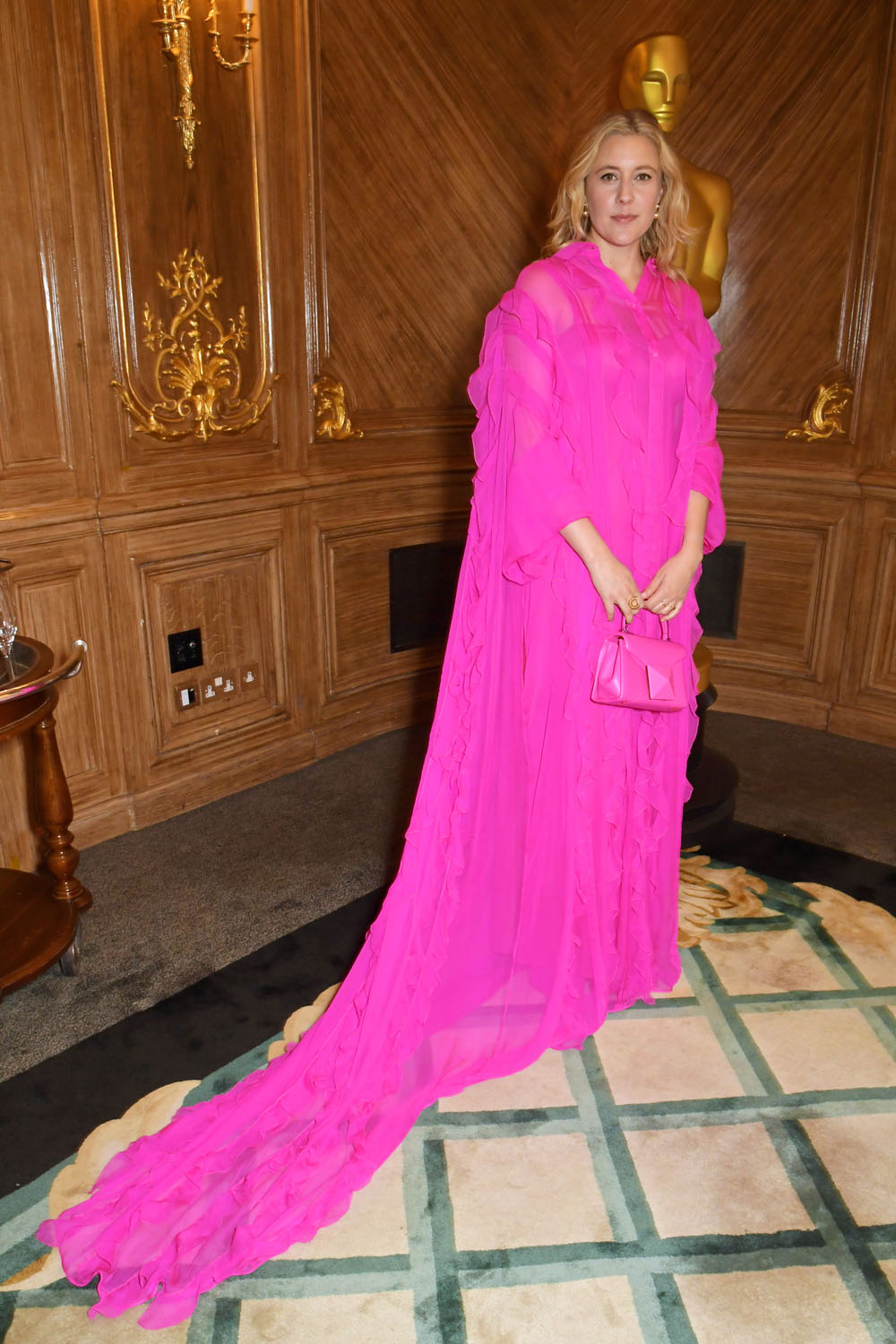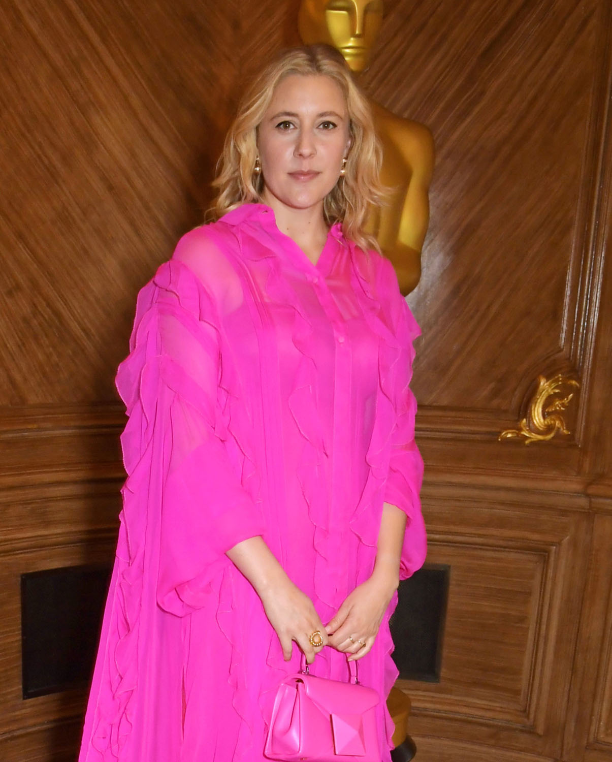 Greta went two for two as she showed up at a luncheon today in a voluminous pink dress that is also excellent on her. The luncheon, by the way, was hosted by the Oscar Academy… so make no mistake, this was a campaign event as White Noise tries to get back into the race.