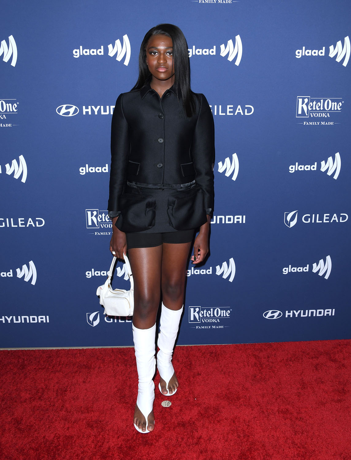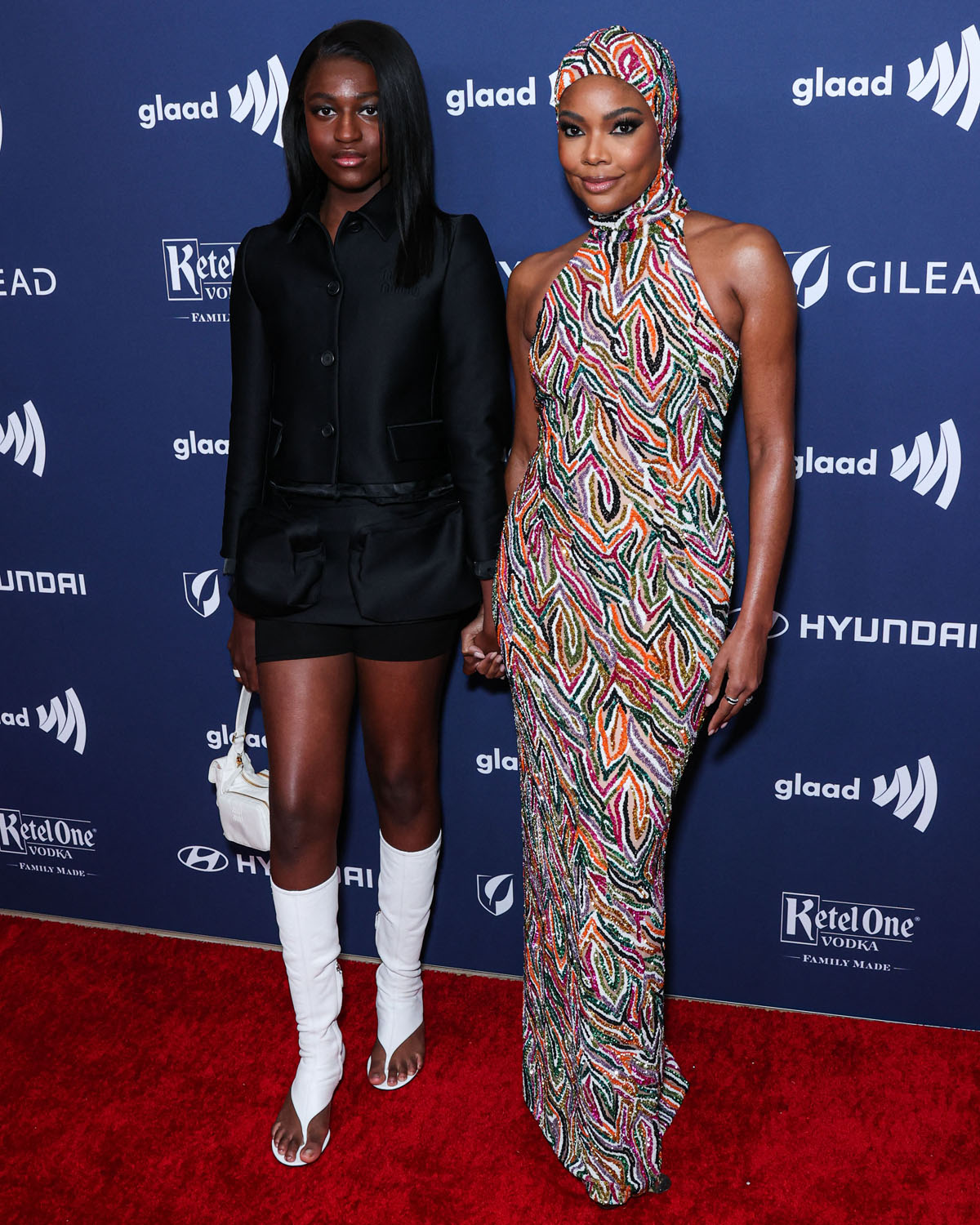 Zaya wore the white version on those Miu Miu boots to GLAAD. Gabrielle, meanwhile, was in Moschino and… ughhhhh….it’s SO GOOD. Like this is all I can manage with this look – just a series of grunts and moans because… well… it’s self-explanatory!