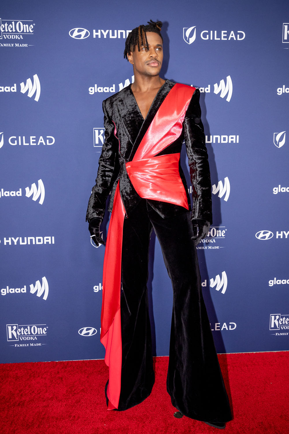 But Jeremy’s dripping, too! On the carpet it was a dramatic black suit with a red body sash.