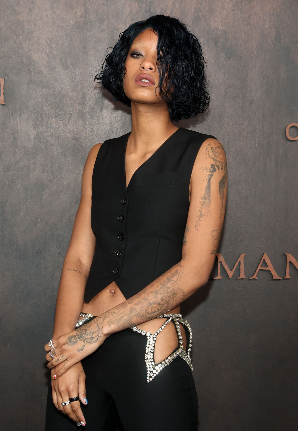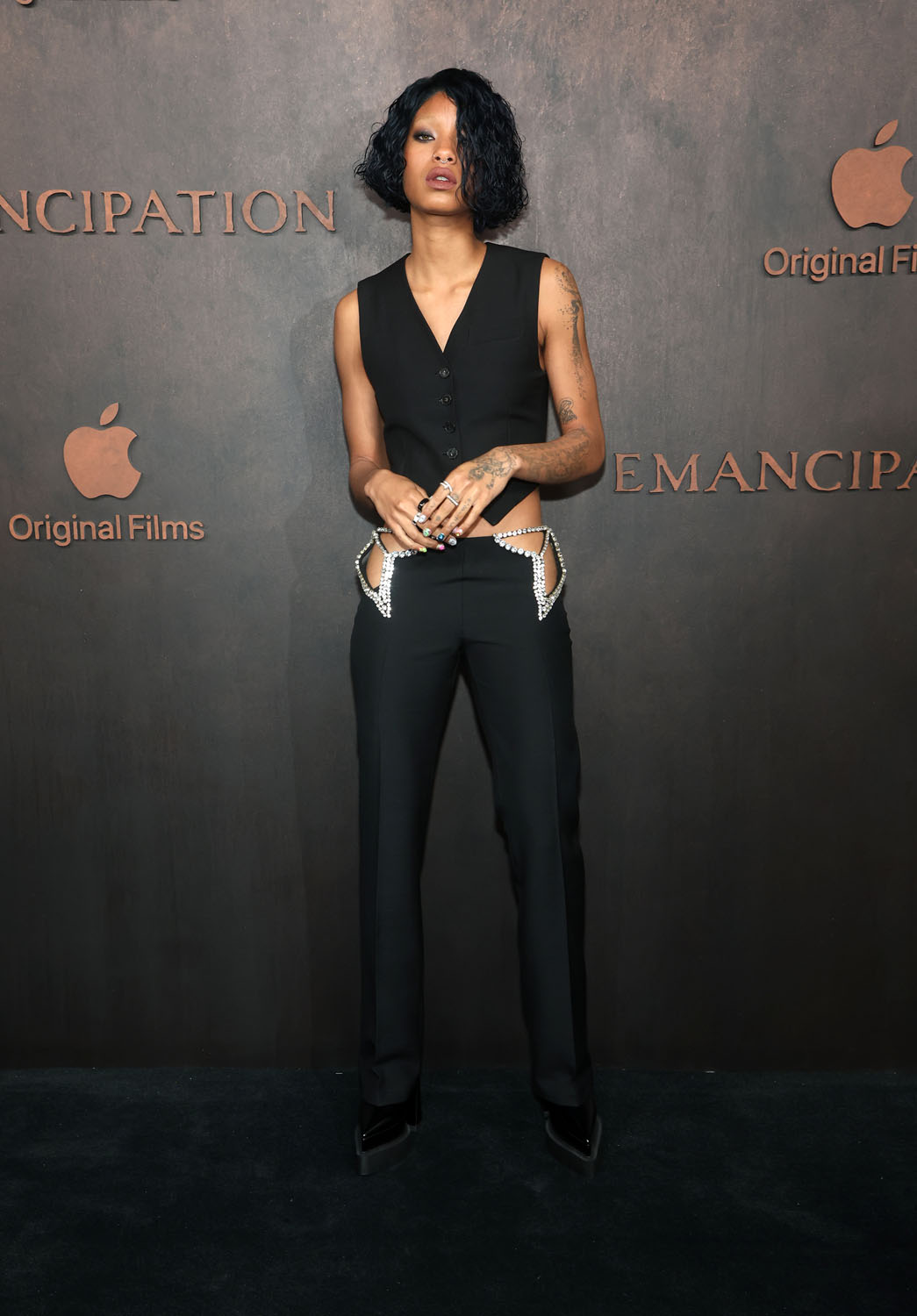 First of all, I’m super into this wavy chin-length bob, it’s giving me bob envy. And then the choice of the simple black waistcoat over these wicked pants…