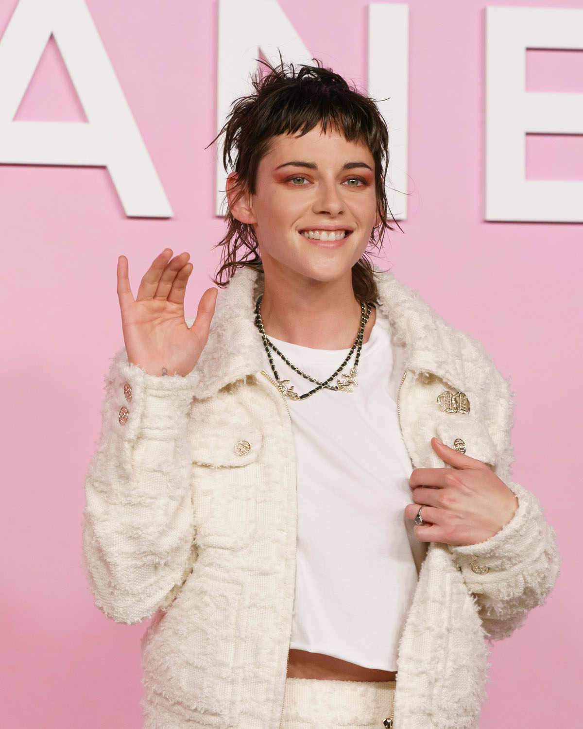 Jennie sat next to Kristen Stewart who was there with her fiancée Dylan. Kristen’s fit is pretty much classic Chanel – the bouclé, the jacket and skirt set, but giving punk instead of prim.