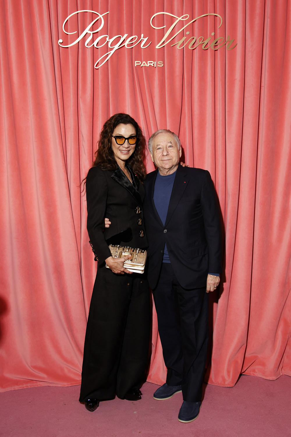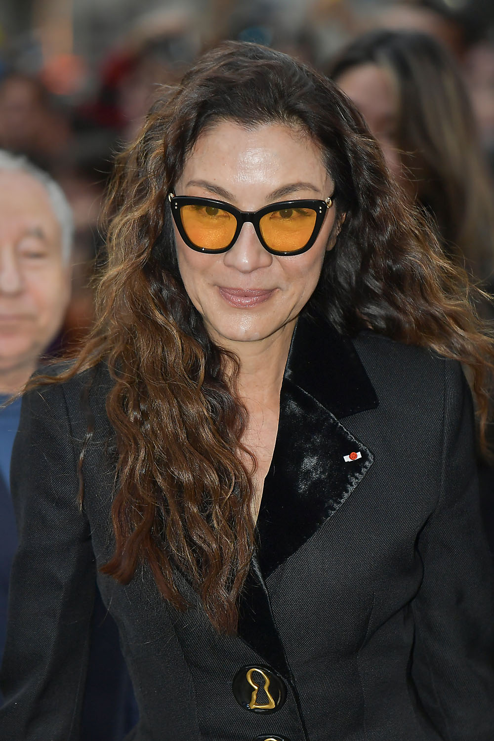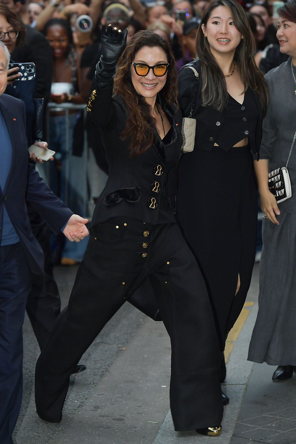 Let’s begin where we should – with reigning Best Actress Oscar winner Michelle Yeoh at Paris Fashion Week. She was seen at the Schiaparelli show in an exquisite black pantsuit and the pictures don’t do it justice so I’m giving you a video. Look at how perfectly tailored the jacket is, how the sides are longer and fall exactly where they should at her hips.