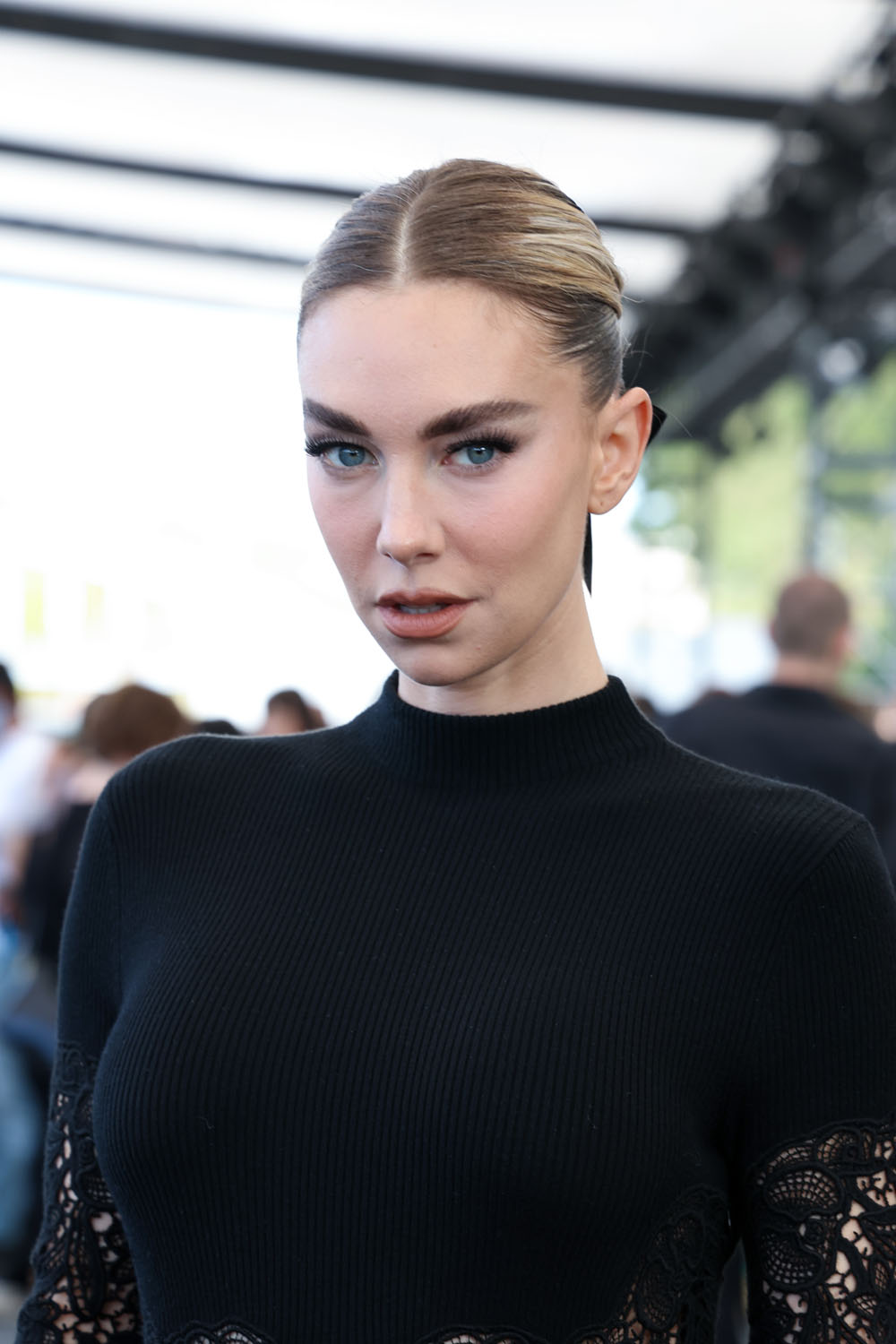 Please also note the black bow in her hair. This is the way to do it that isn’t annoying and twee (Princess Kate). If you want to try, Urban Outfitters has a pretty great selection of hair accessories and a lot of ribbon bows in different sizes. A black bow is easier for Vanessa with her blonde hair because the black pops out way more, but on dark hair a white bow can bring the drama, too, with the right style and outfit.