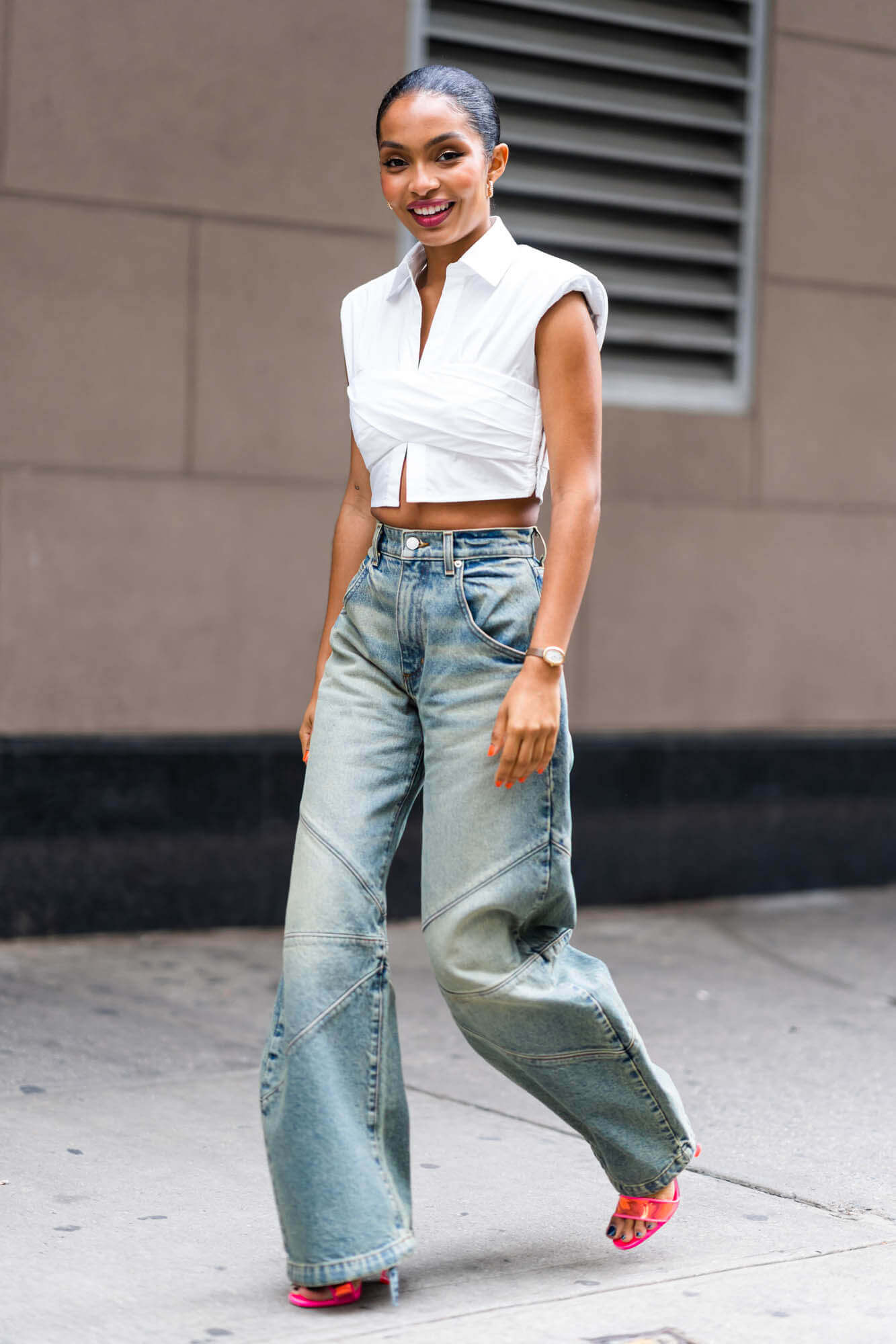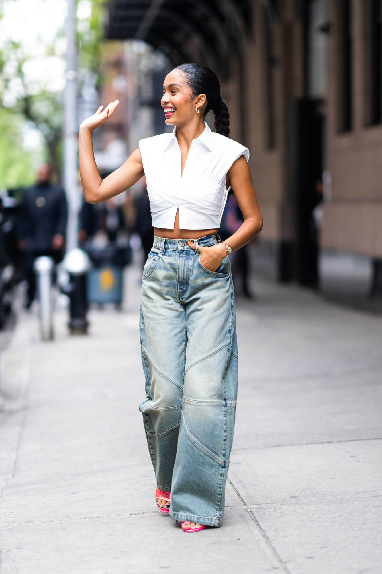 Not done with denim, though. Here’s another pair of jeans in a lighter wash with a cropped white shirt and padded shoulders: