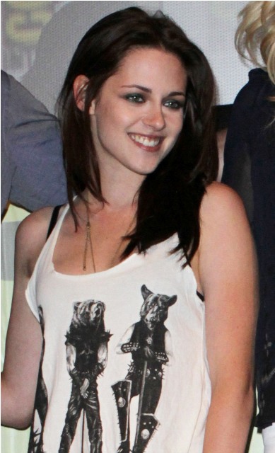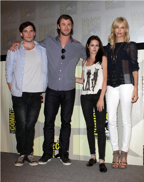 Attached – Stewart, Theron, Chris Hemsworth, and Sam Claflin at Comic-Con promoting Snow White and the Huntsman. I liked her makeup that day. And here’s Stewart arriving in London at the weekend to begin shooting.