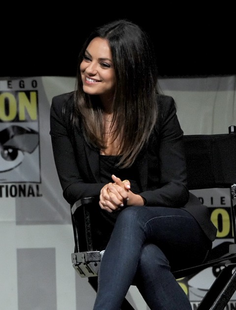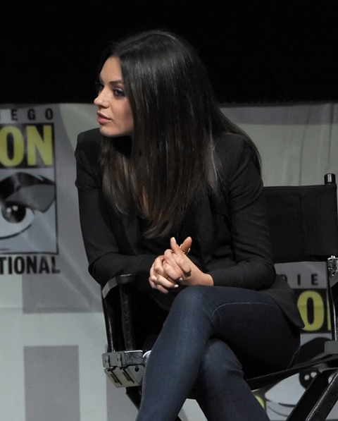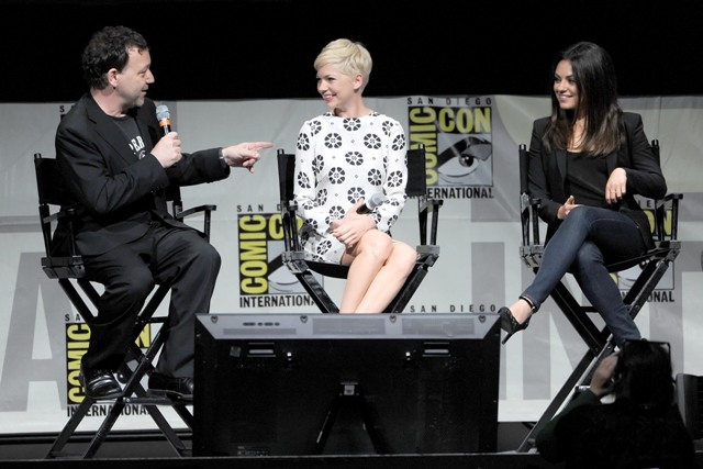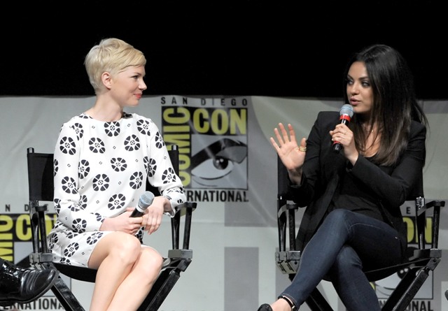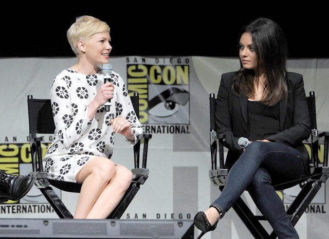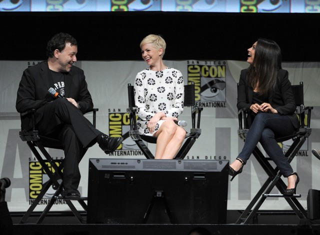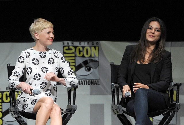 Here are Michelle Williams, in a gorgeous shift, and Mila Kunis at Comic-Con with Sam Raimi. Not sure where Franco was. Probably working on another enlightening movie review.