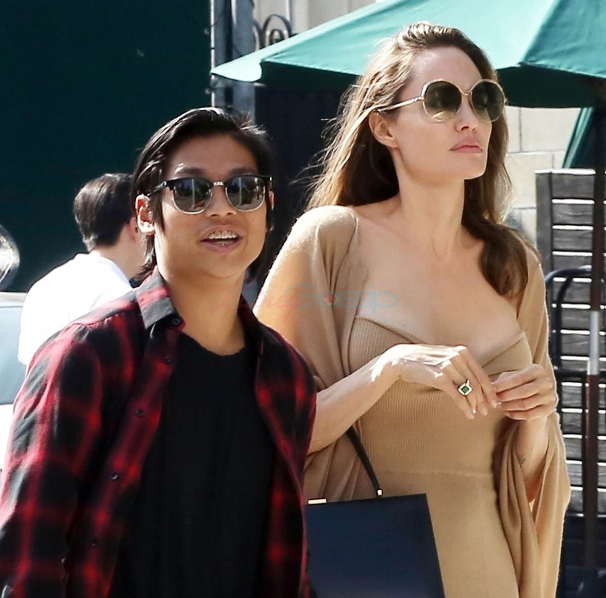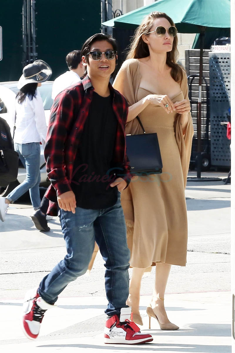 Here’s Angelina out for lunch and some shopping with Pax this weekend and not in black but in a sexy camel colour strapless dress with a matching wrap, continuing to step out with the kids to show us how close she is with them. She, too, seems determined to keep with the consistent media messaging. Is it working as well as his?