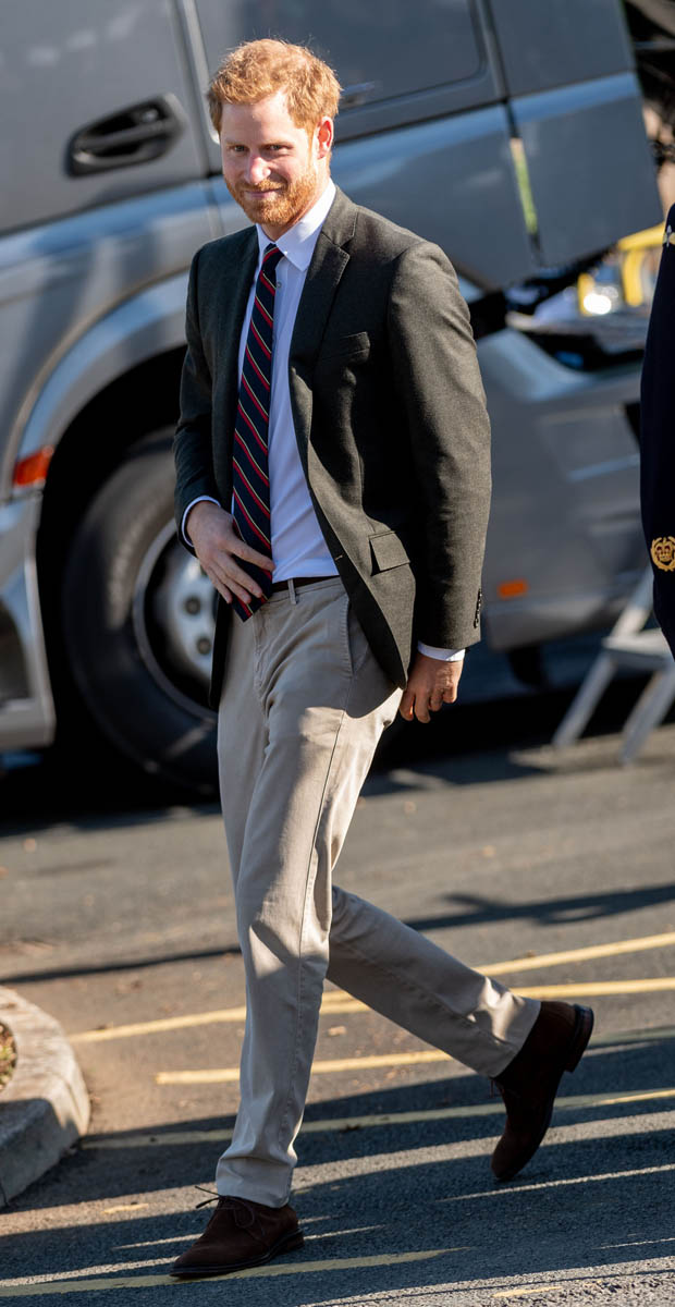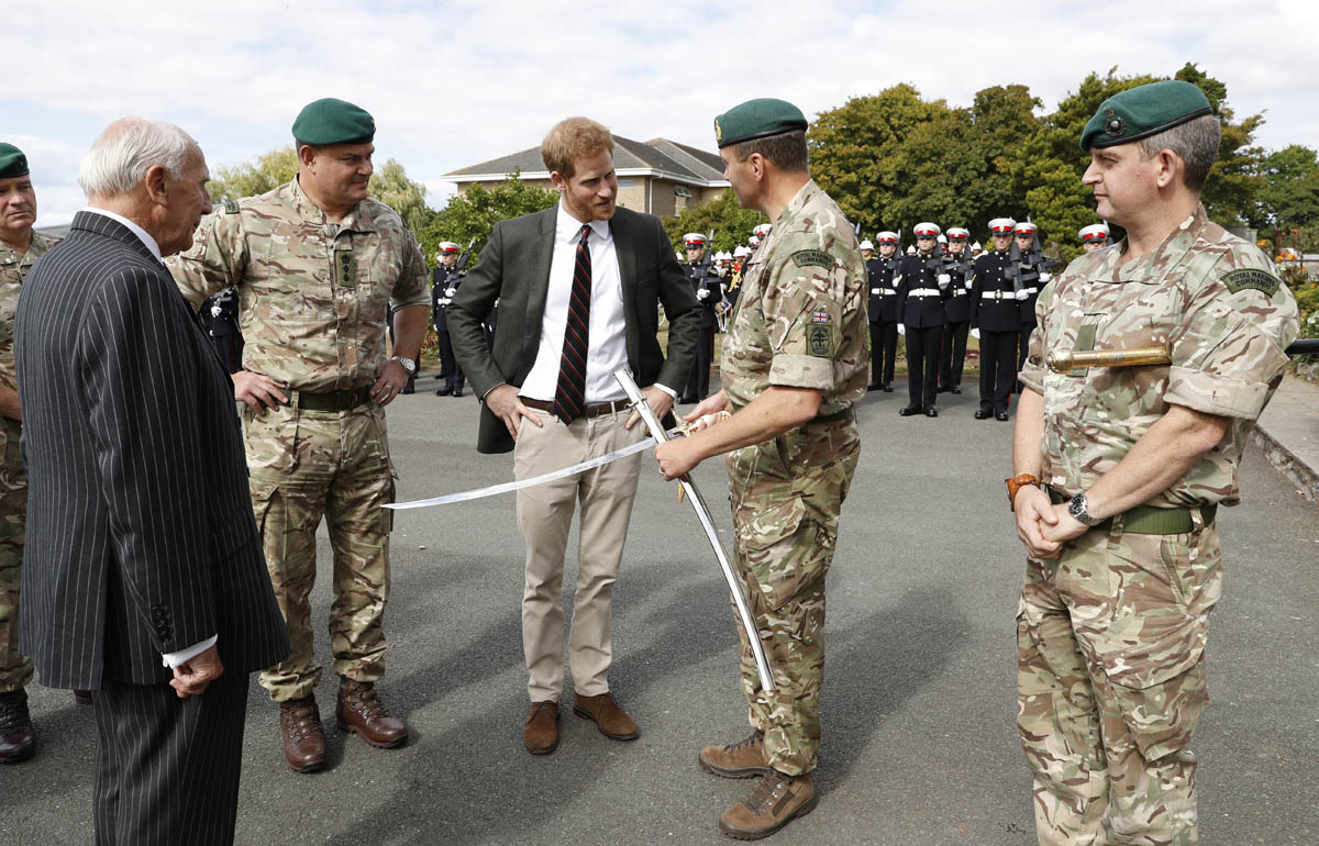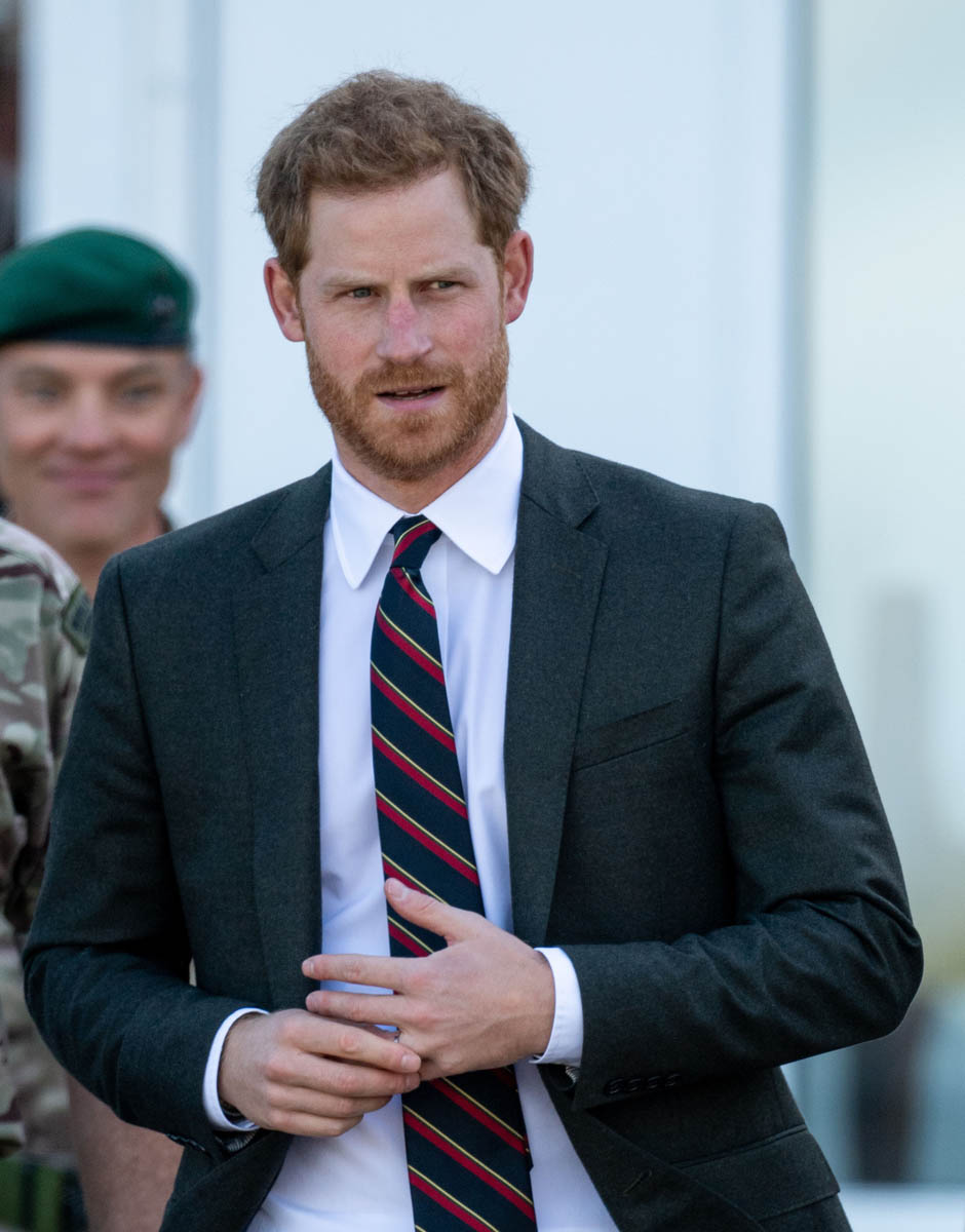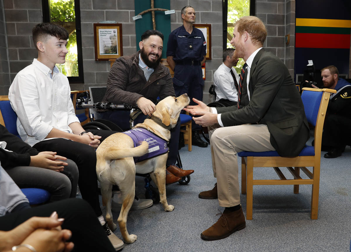 Here’s Prince Harry today visiting the Royal Marines and having a cute moment with a service dog. Can we please get some shots of him with his own dogs?!