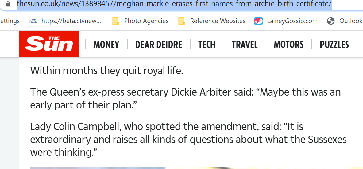Lady Colin Campbell. If you’re unfamiliar, she’s been aggressively and unreasonably critical of the Sussexes pretty much from the jump, and she also has said some other f-cked up sh-t recently that isn’t related to Harry and Meghan. You can google it if you want – shouldn’t be hard to find. To get back to this story, for whatever reason, then, Lady Colin Campbell woke up one day and decided to go poking around in Archie’s birth certificate. Why? What was she looking for? What was she curious about?
