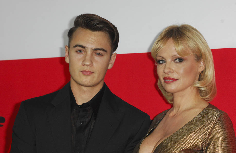 Pamela Anderson stepped out last night in LA at the premiere of The Gunman, escorted by her son Brandon. Pam recently filed for divorce from Rick Salomon and has resisted the urge to get back together with him. So far. It’s been a month. Good.