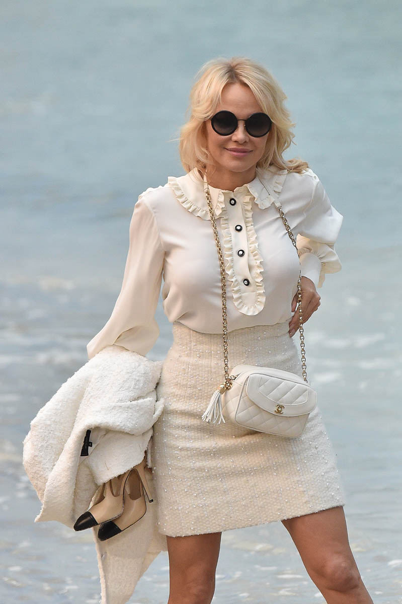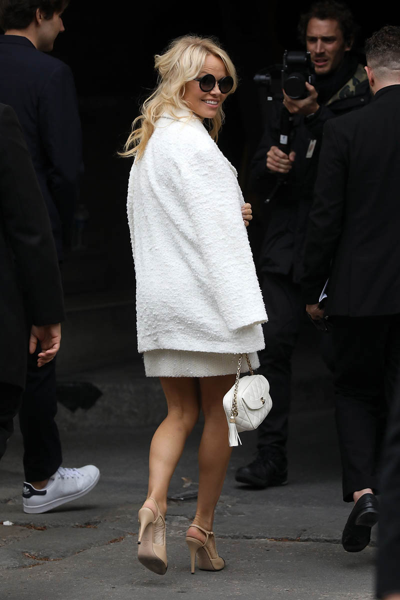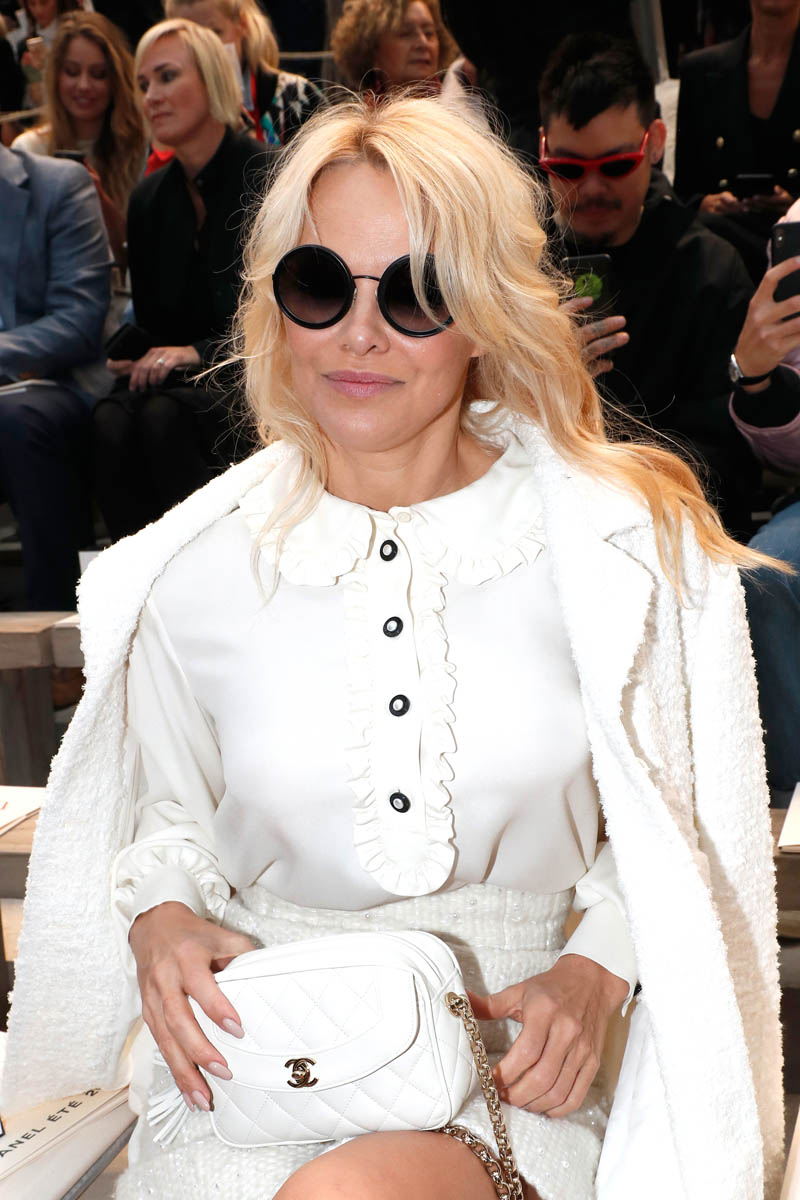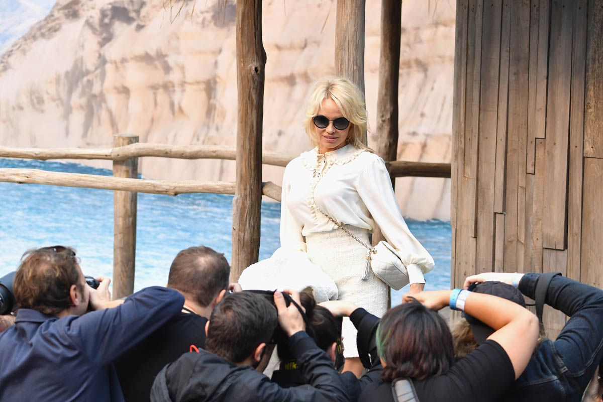 Pamela Anderson sat front row at the Chanel show today at Paris Fashion Week. There was a time where that would have seen impossible. But Pam lives in Europe now. She’s dating a French soccer player. Her Instagram is all black and white and as Vogue points out, she also captions in French. This is Pamela Anderson 2018. In Chanel at Chanel. For a Chanel show on a fake beach, showcasing a collection that they’re saying is all about “giving women a break”.