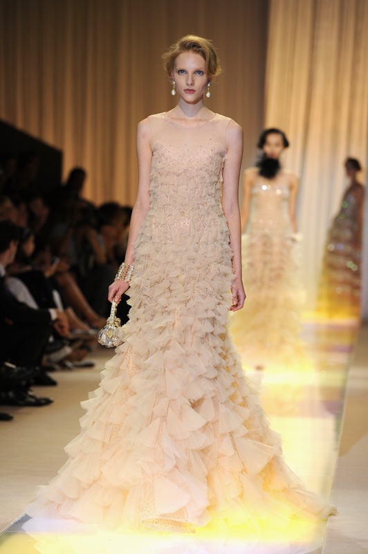 There’s a lot of champagne happening here. Champagne coloured gowns in varying – some with tiered skirts, some with a lot of ruffling, and none of it particularly inspiring. I’ve been saying for years I think Mr Armani stayed in the 80s.