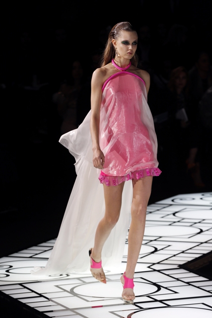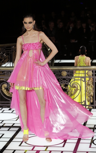 Halle Berry’s Versace was one of the worst at the Golden Globes last week – click here for a refresher. Donatella’s latest collection for Atelier Versace isn’t much better. Everything continues to look cheaper and cheaper. “Borderline tacky” has always been part of the Versace brand, sure. But the quality and construction always saved it from seeming like it was truly Cavalli. But check out the dresses with the neon trim. They look like they’re about to fall apart. Maybe one piece is wearable at the Oscars then – the black gown with the gold plated shoulders? Maybe.