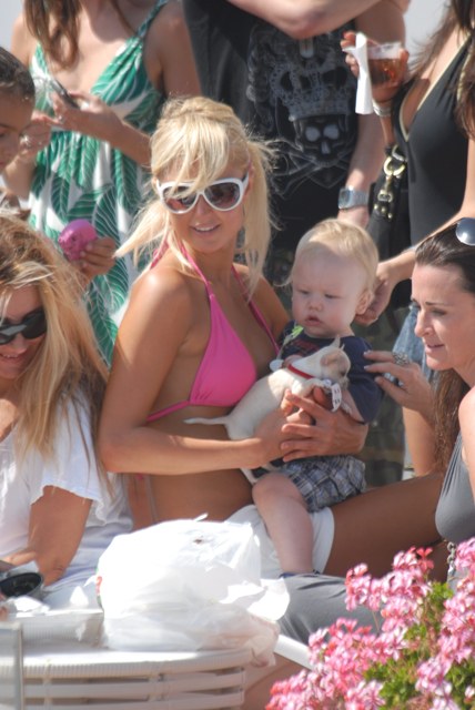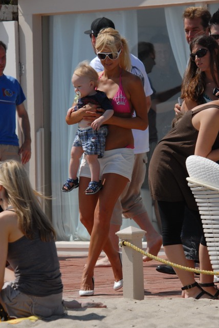 Hollywood Ebola holding court at her Malibu beach house this weekend, entertaining the pappies, and also recruiting a new accessory – now that she’s exploited her dogs and saturated the market with photos of herself abusing animals, Paris has unleashed her virus all over a small child.