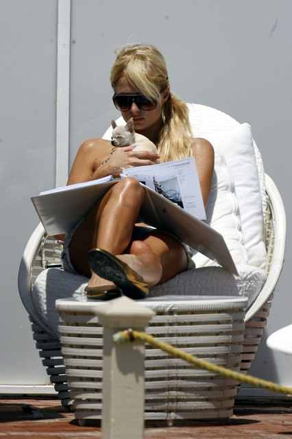Also – check her out with her wonky eye at the beach the other day, abusing her dogs and giving paps an eyeful of a photo binder she was going through from a shoot she did a few weeks ago for some German magazine and also potential images for her clothing line, on sale in 2 weeks at Kitson. And this I also don’t understand. If her only contribution to society is how to suck good c*ck and spread her legs, why is clothing even a requirement?