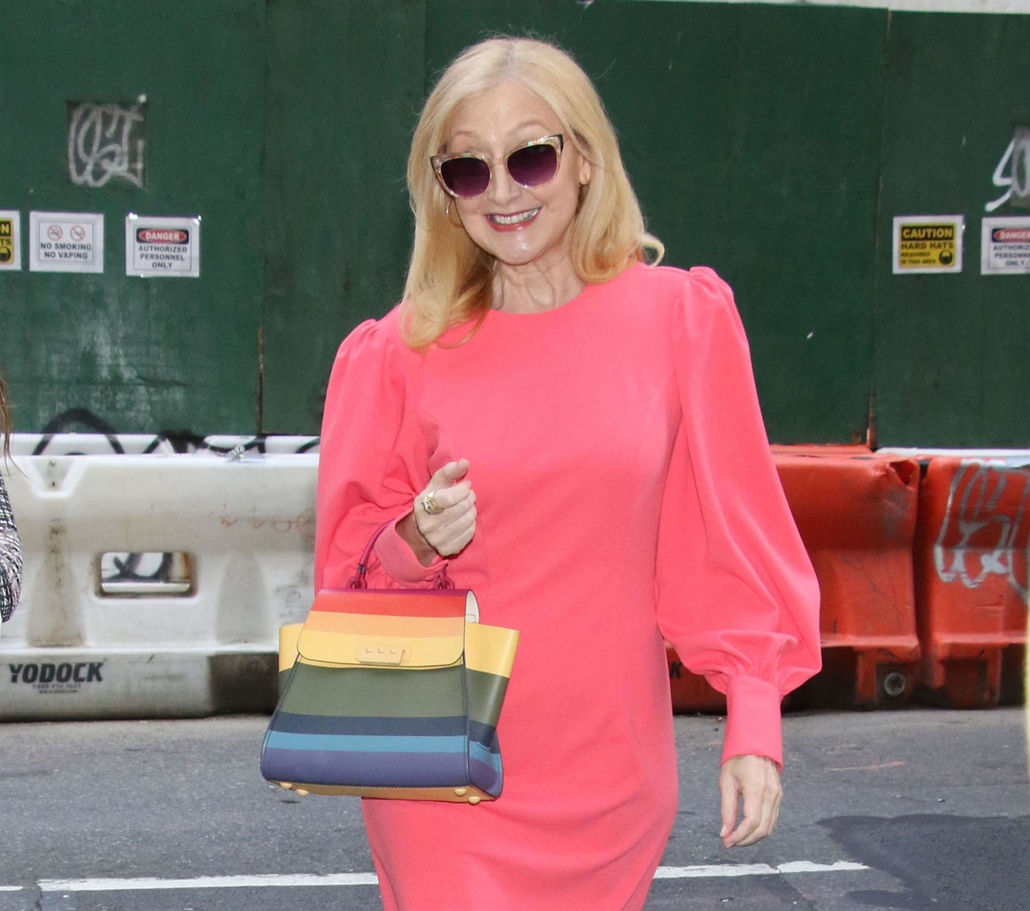 Patricia Clarkson is wearing the sh-t out of this pink dress, and carrying the sh-t out of this rainbow striped bag. I also LOOOOOVE the shoe choice with this fit. (Go Fug Yourself)