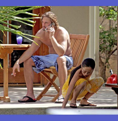 There are many of you…many, many, many…who believe that Josh Holloway deserves a spot on the Freebie 5. And while he"s not my type, I can certainly see why he appeals to so many of you. Like Evangeline, Josh is expected to keep up that hunky physique. So here he is, sweating his stuff, doing his best to earn his place among your other bedroom fantasies. I wonder if that"s his wife in that photo by the pool. Can"t stand that woman. At every awards show she is like practically pushing him out of the camera shot, almost as bad as Patrick Dempsey"s broad, but perhaps a tad less "I"m a f&cking c-bomb." So hot...Such a waste. Sigh.