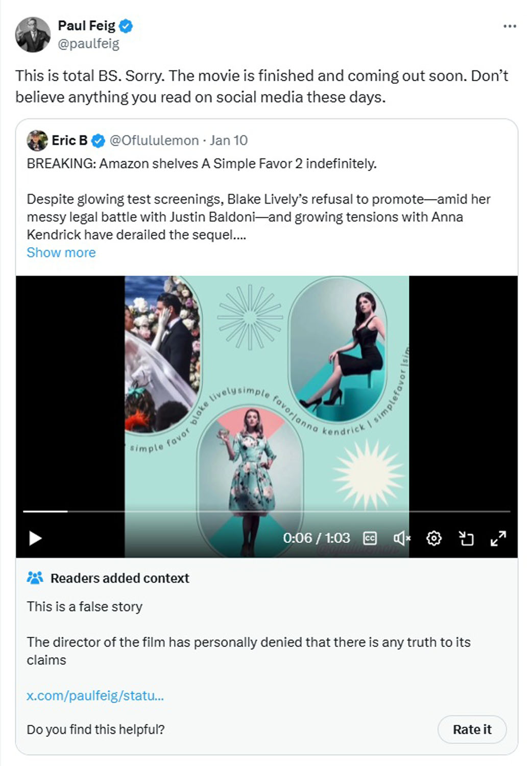 Despite all the evidence that Lively is/was the victim of a coordinated smear campaign, some people are really trying to cast her as the ultimate villainess, including some dipsh-t on Twitter who insists that A Simple Favor 2 has been “shelved” by Amazon because Lively is “refus[ing] to promote the film” which is heightening “tension” with Kendrick. You can read that nonsense here, or you can just read director Paul Feig’s direct response: