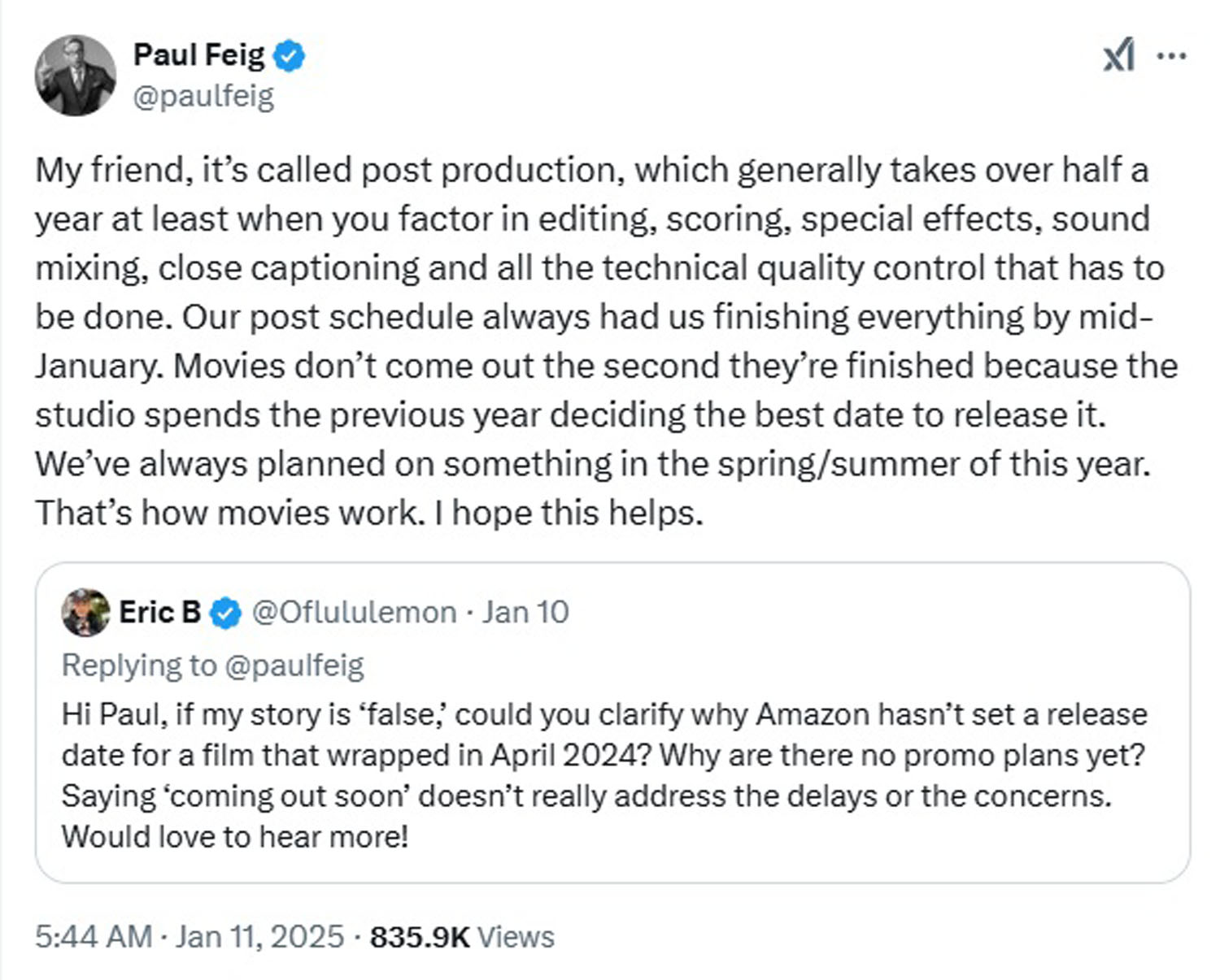 Rather than just admit that he either bit on bad info or totally made it up, this loser pressed Feig about the lack of release date for the sequel. Feig, displaying far more patience than I would have in such a situation, replied that they are only just completing post-production—on schedule—and expect to release the film summer-ish: