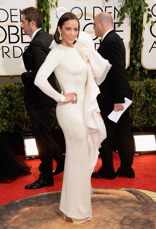 Did you forget how annoying Paula Patton was at the Globes two years ago? (Click here but you probably don’t need to.) Perhaps she thought you did though because she decided to do it again…this time with some dirty sheets hanging off one shoulder like she’s on her way to the laundry room.