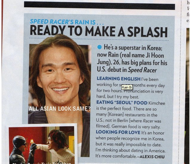 It’s a great write- up and would have been a wonderful coup to build Rain’s profile…only the photo they used isn’t actually of Rain. Pictured on the page here instead is Karl Yune, also an actor, brother of Rick Yune (former boyfriend of Lisa Ling) but no relation to Rain. Believe it or not, we Asians don’t all have grandmas called Mrs Wong.