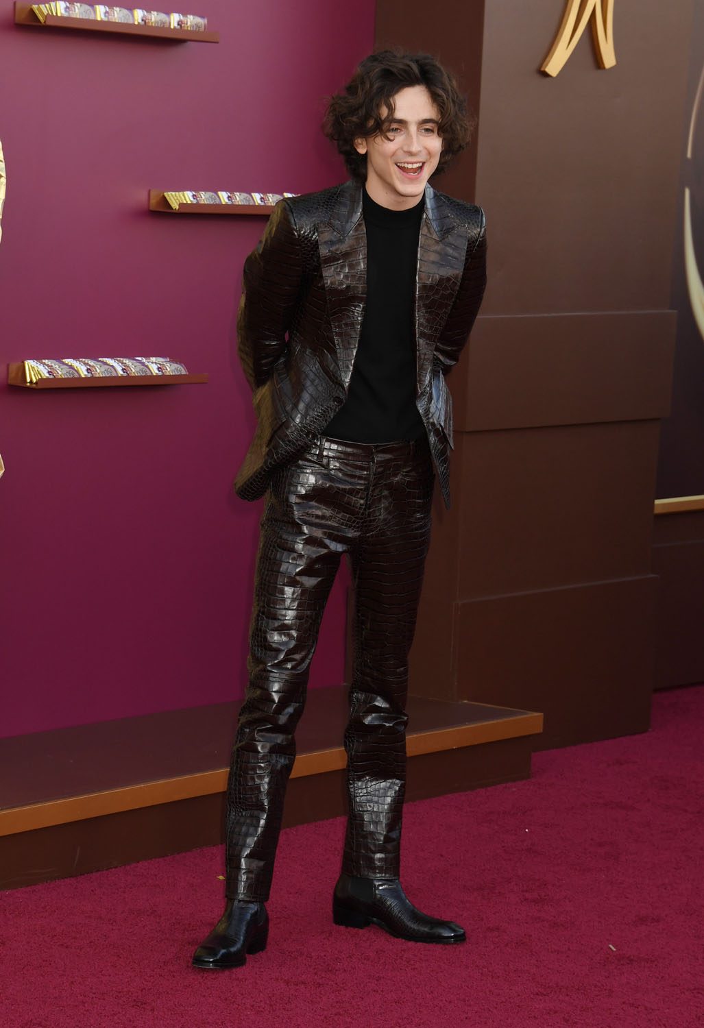 I am appreciative of Timmy’s suit – black alligator jacket and pants over a mock turtleneck and boots, it’s giving Jagger-Wonka-Dylan, which is the next role that Timmy will be inhabiting, and the look establishes a through-thread between the characters. Timmy’s Wonka is an eccentric dreamer – odd and mysterious but also earnest. I’m not saying that he’ll be playing Dylan like Wonka, LOL, but as an artist, I wonder if he’s searching for the common ground.