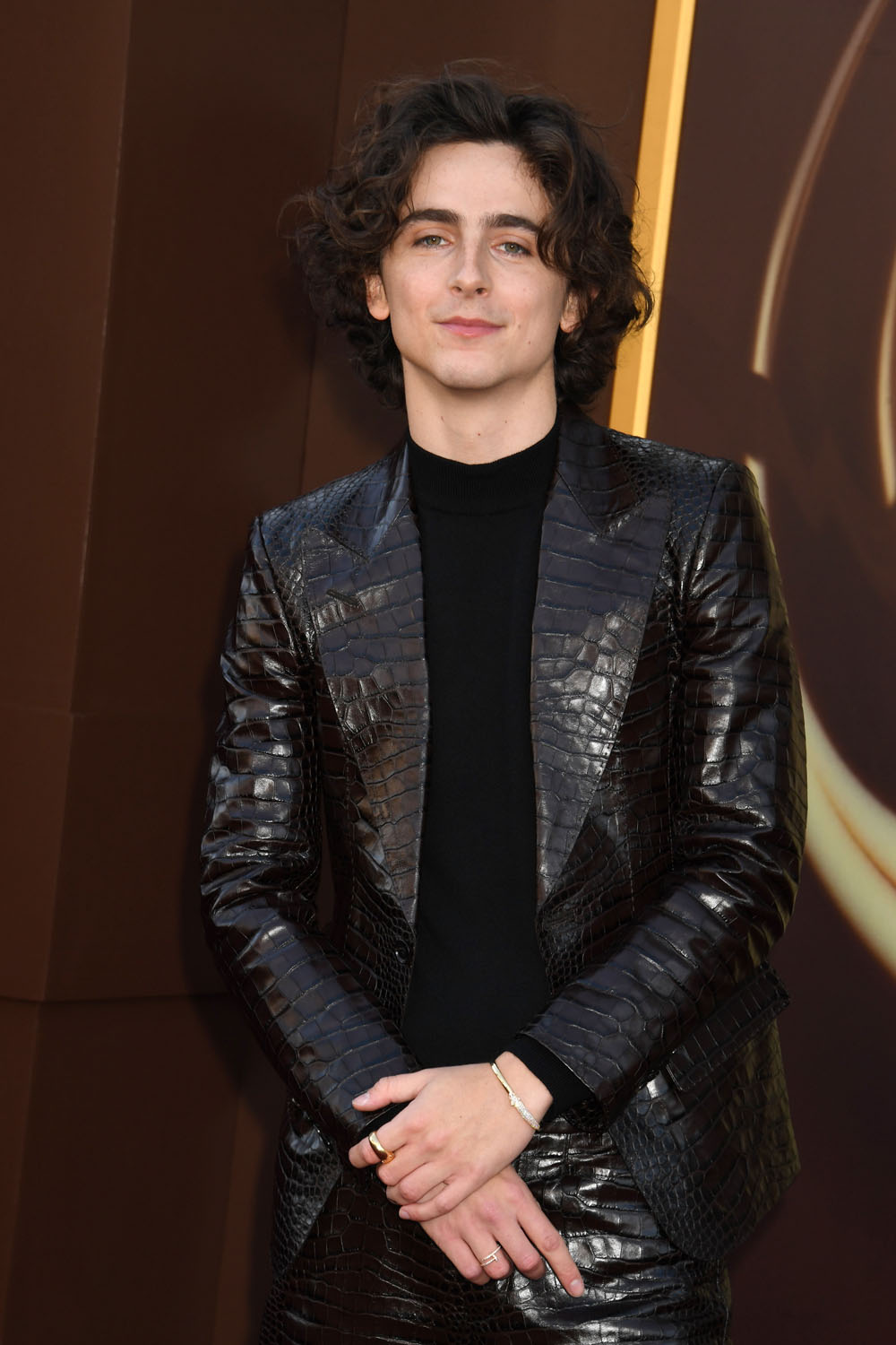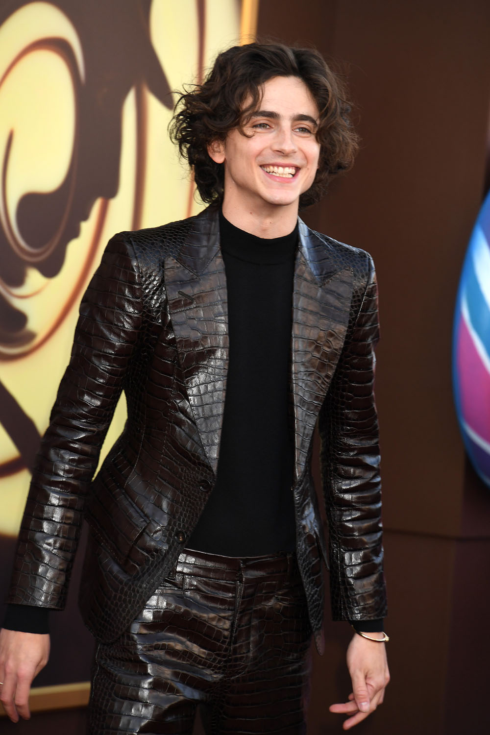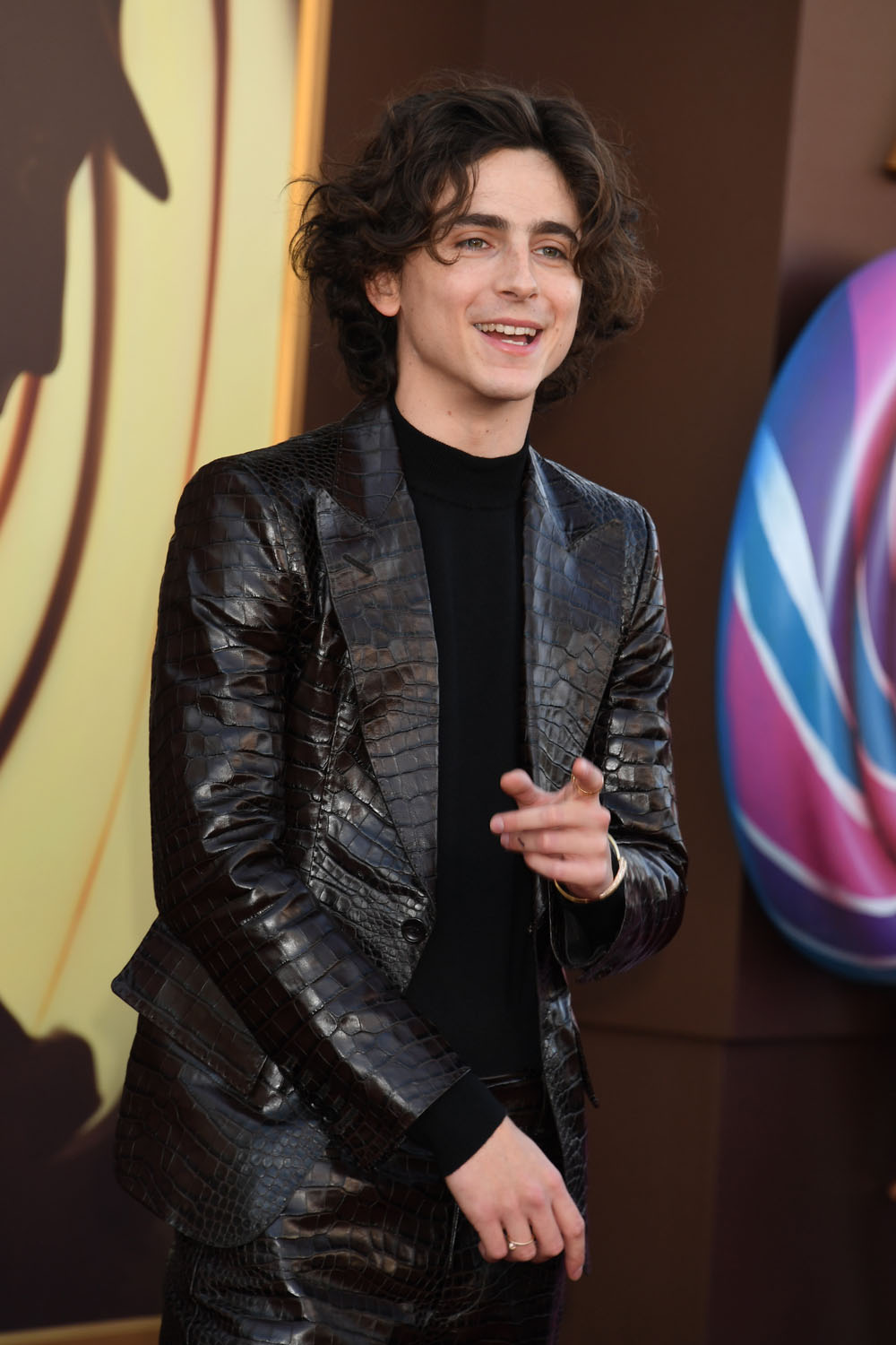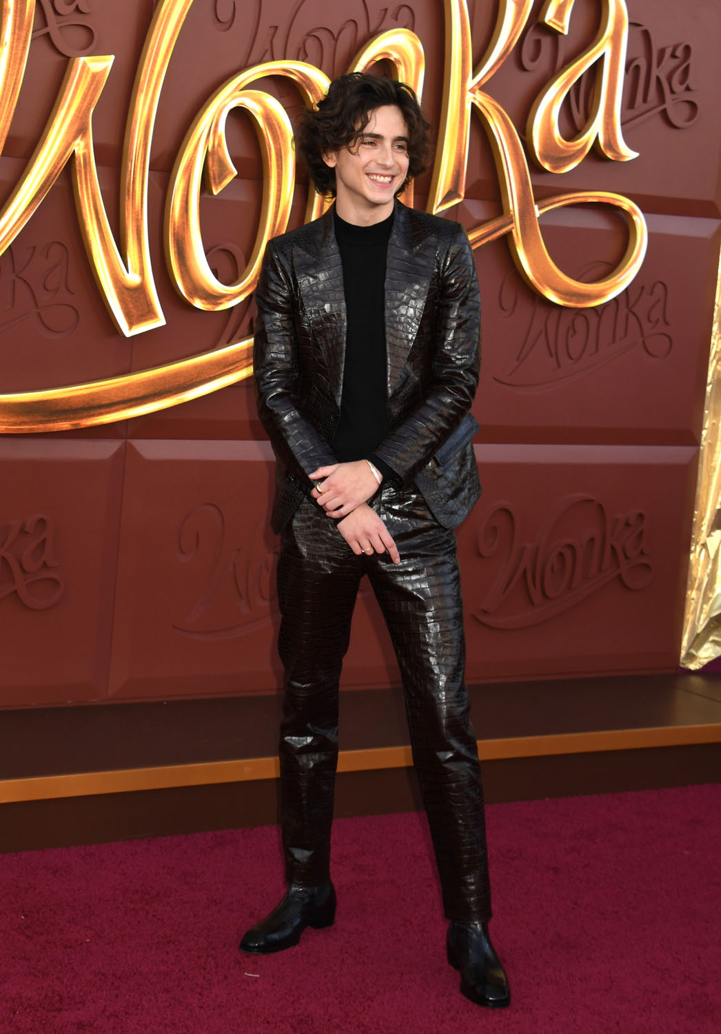 I am appreciative of Timmy’s suit – black alligator jacket and pants over a mock turtleneck and boots, it’s giving Jagger-Wonka-Dylan, which is the next role that Timmy will be inhabiting, and the look establishes a through-thread between the characters. Timmy’s Wonka is an eccentric dreamer – odd and mysterious but also earnest. I’m not saying that he’ll be playing Dylan like Wonka, LOL, but as an artist, I wonder if he’s searching for the common ground.