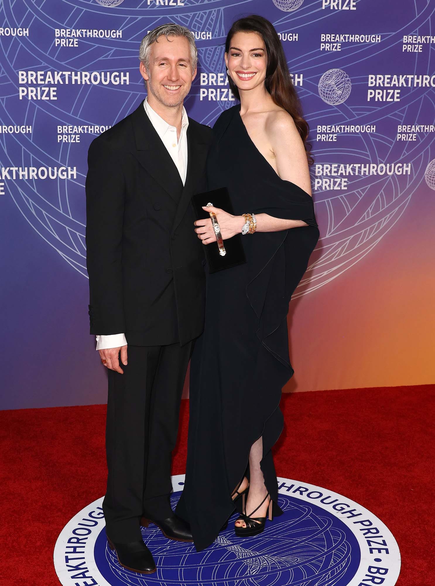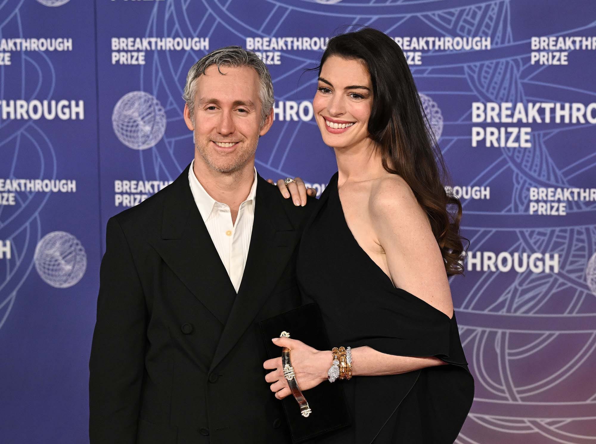 Adam Shulman and Anne Hathaway attend the 12th Breakthrough Prize Ceremony at Barker Hangar on April 18, 2026 in Santa Monica, California