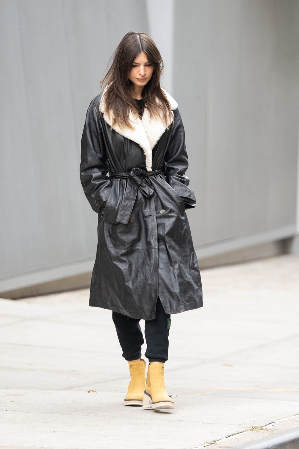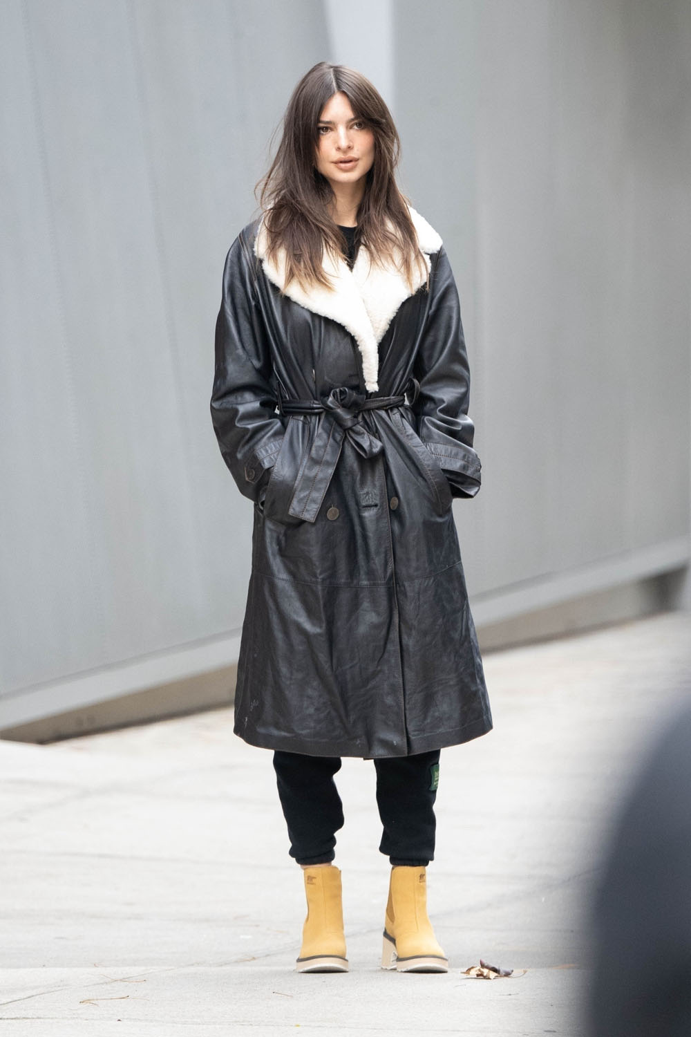 Presumably because she had work this morning. Emrata was seen first thing out for a shoot, in a leather coat and yellow boots. She stepped out again before noon in a cut-out dress, so the takeaway here, I guess, is that whatever she was up to with Pete on his birthday wasn’t stopping her for doing her thing the next day.