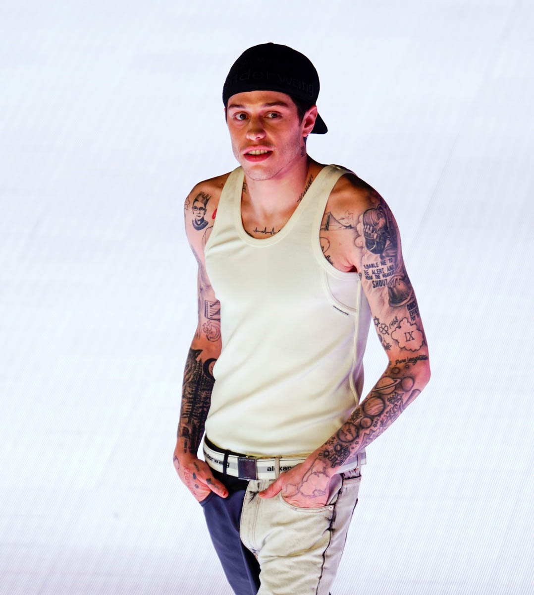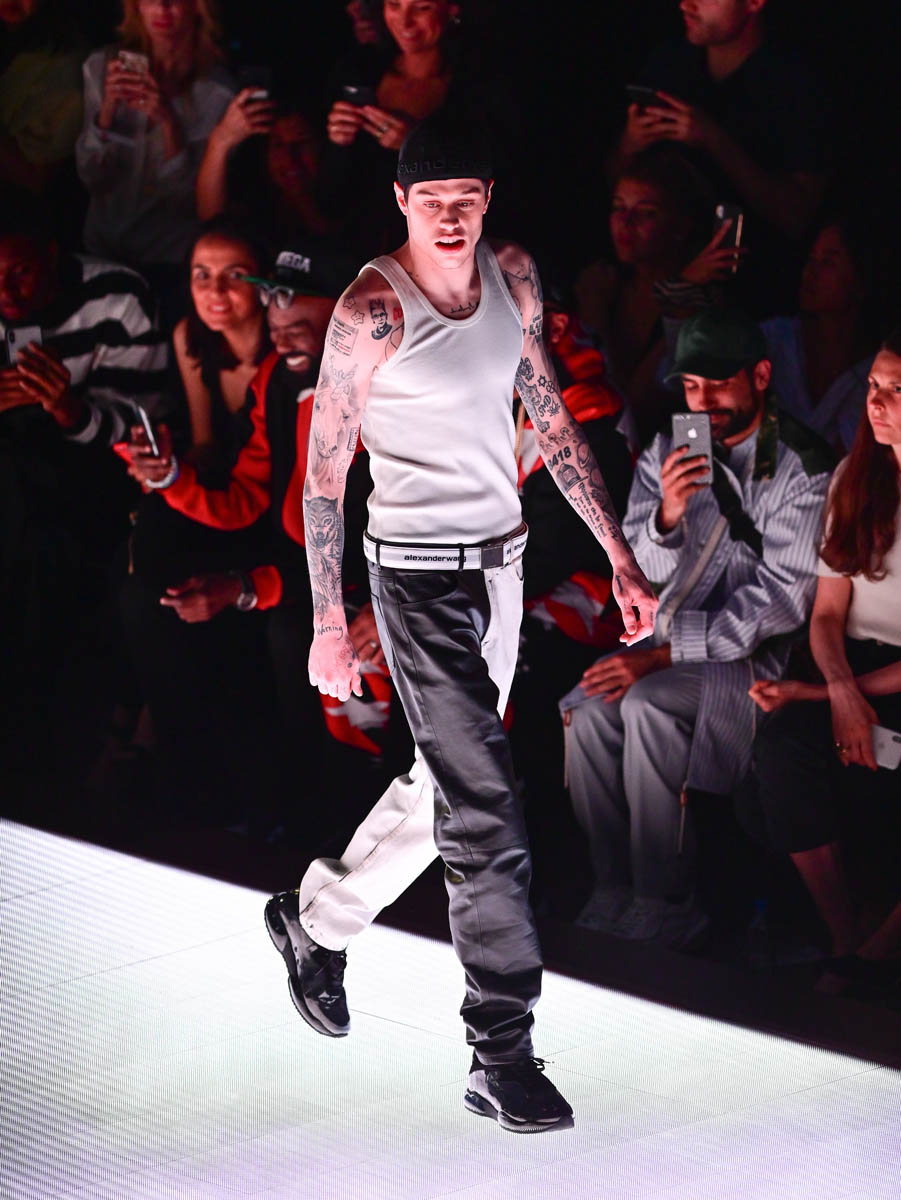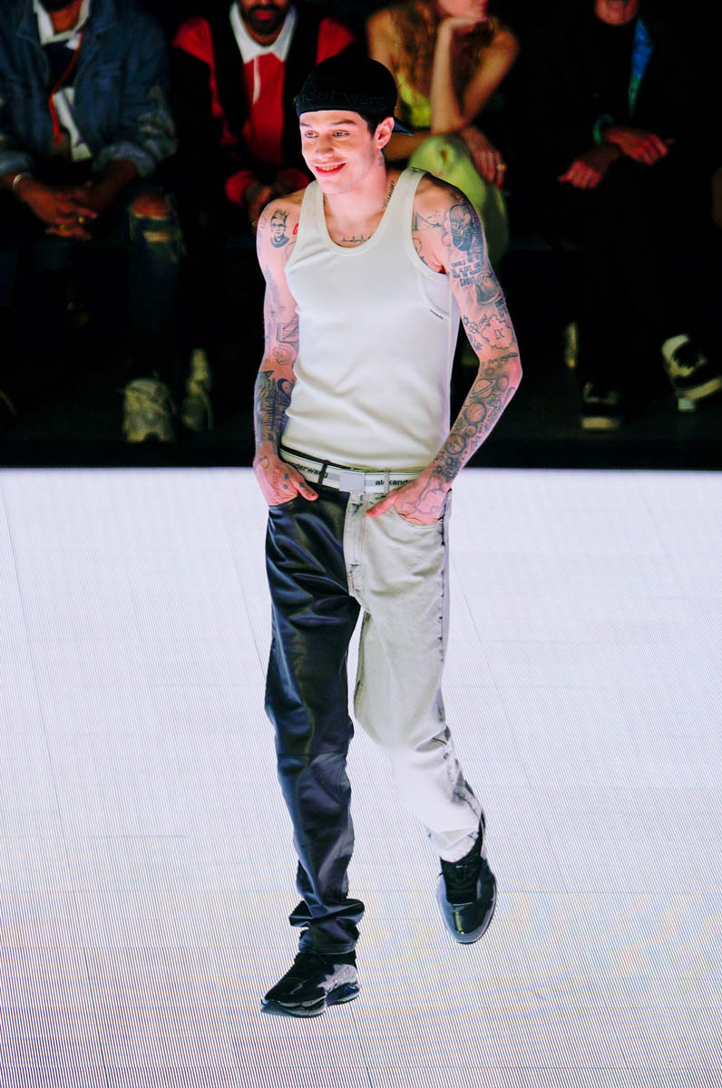 Now back to Pete Davidson. Pete’s appearance on the runway was a surprise in the same way that finding out that the company that owns GEICO also owns Dairy Queen is a surprise (it’s true, look it up!). They don’t seem like they should go together, and neither do Pete and runways. Pete’s outfit was a backwards, black Alexander Wang cap, a white tank showing off his many tats (can you see the ones from Ariana?), a white belt with Alexander Wang’s name on it, and a bi-coloured black and white pant paired with a black shoe.