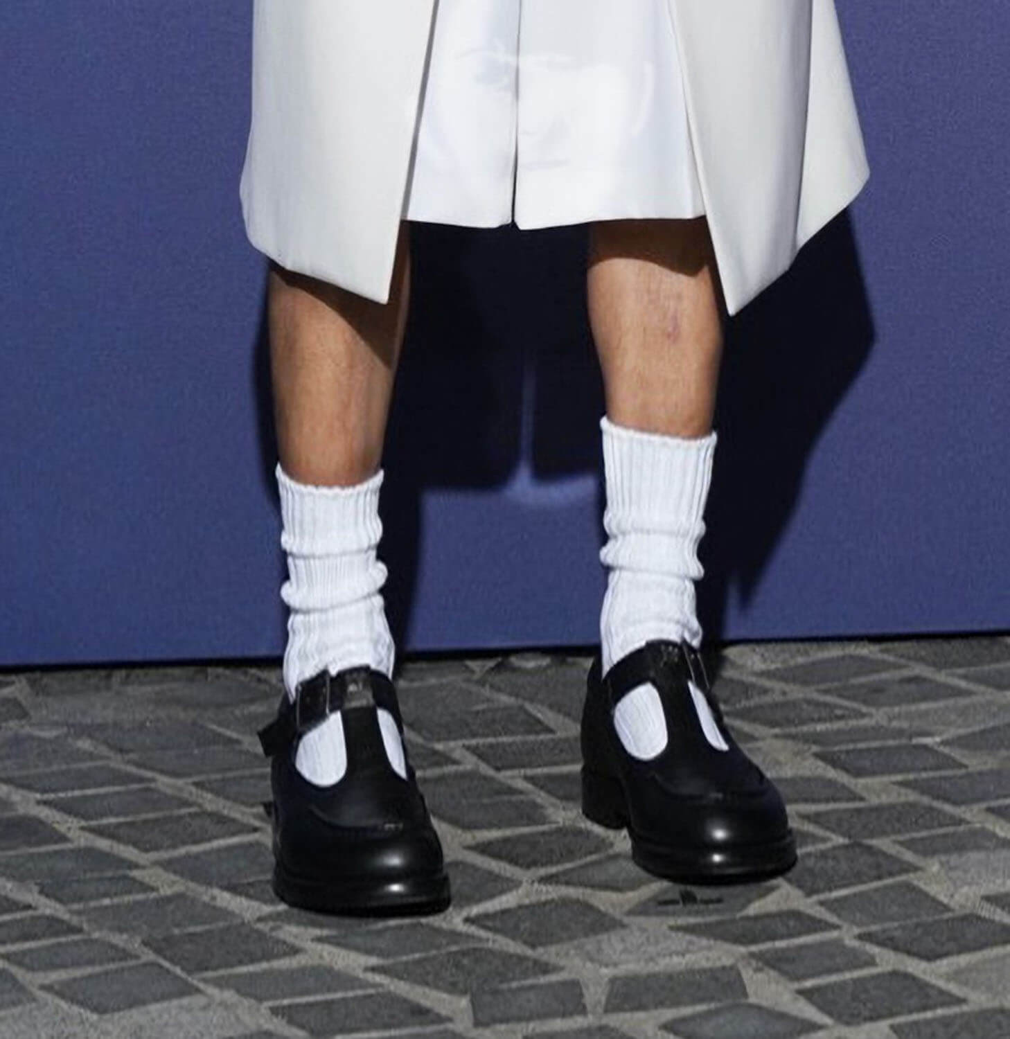You think it’s a suit with a long jacket, but he’s actually wearing shorts, with socks, and black Mary Janes.