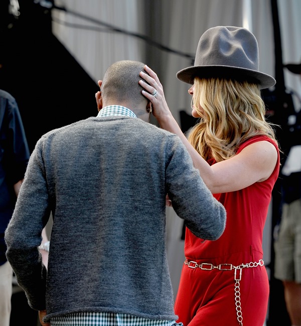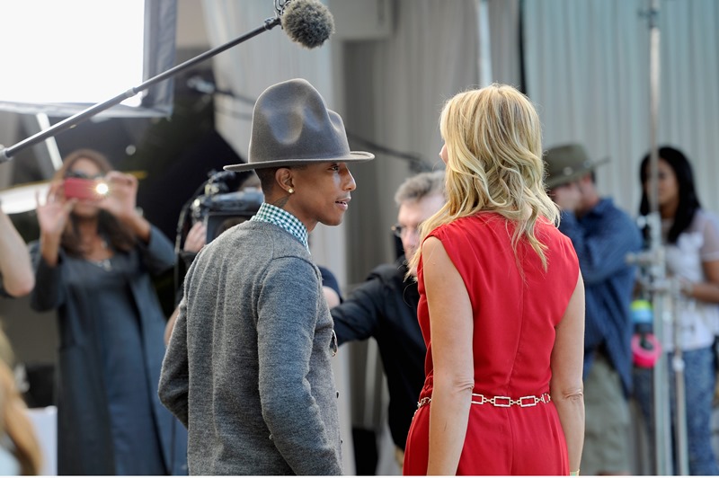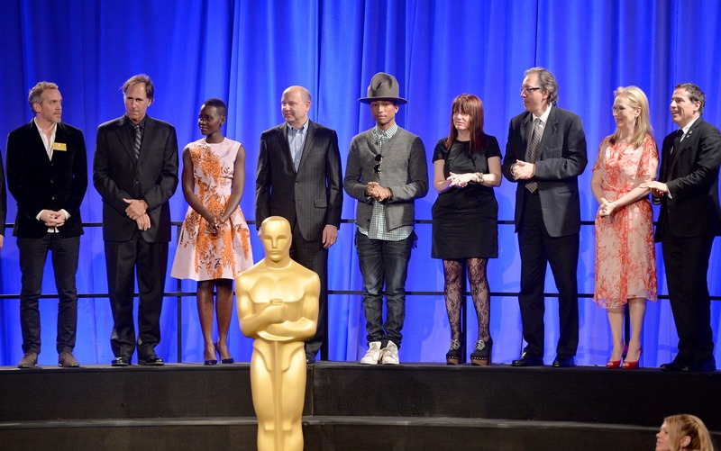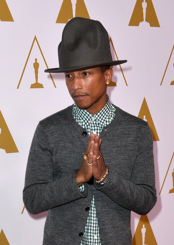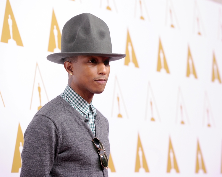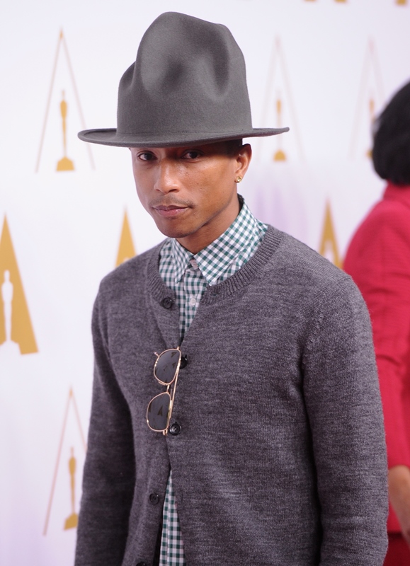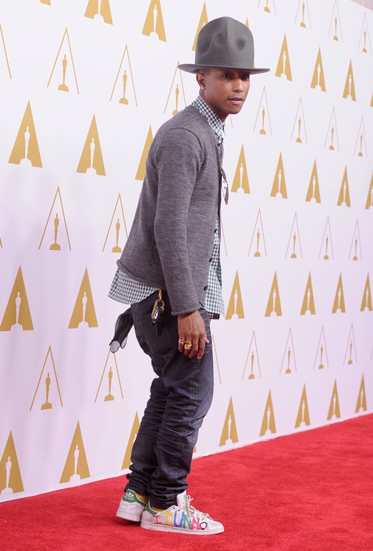 We talked about this last week – that Pharrell’s Grammy hat comes in grey. He was wearing it in London when we saw him last (click here for a refresher) and I was wondering whether or not he’d take it to the Oscars, maybe in gold.
