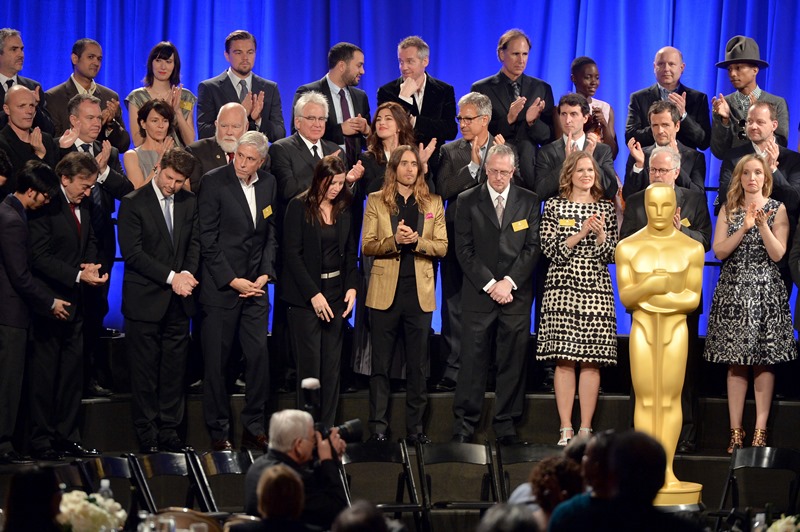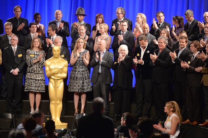 Not in gold, but he did wear it to the Oscar Nominees’ Luncheon yesterday. It’s killing me the way the hat is standing out in the class photo. Pharrell is up against Bono. Bono will probably win on stage. But on the red carpet? No one steps to Pharrell on the red carpet.