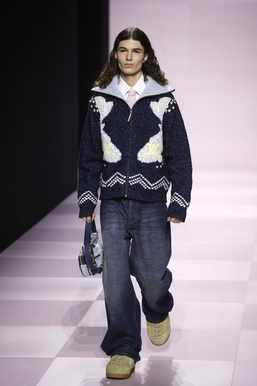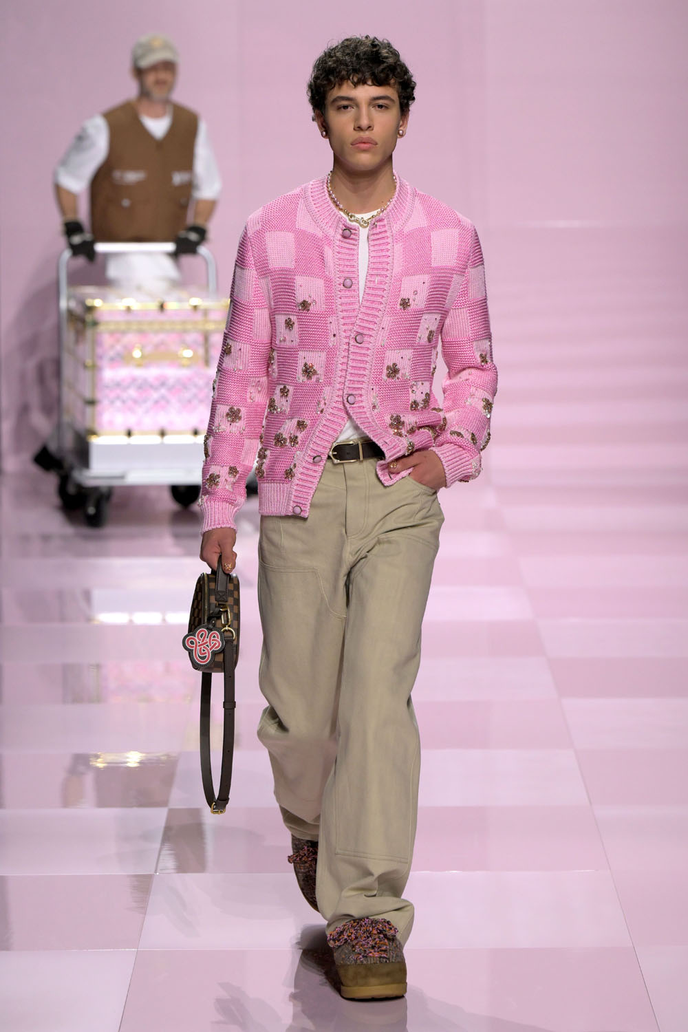 This collaboration, then, was obviously going to be streetwear, but super elevated. It’s accessible in that it’s not a huge style swing, therefore highly commercial (which they need right now considering the decline in luxury profits), and quite versatile. As in, this is classified as menswear as a distinction between the house’s two departments, but so many of the pieces can be worn by anyone. For example, if I could afford it, the first thing I would buy is the pink damier cardigan with the blossoms, OMG.