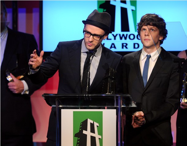 Last night the cast of The Social Network was named Best Ensemble at the Hollywood Awards. Look at them onstage. Why is Andrew Garfield way down to the side while Pippy is up front with Jesse Eisenberg eating up all the glory? Seems like Jesse wants to tell JT to Sit DOWN too.