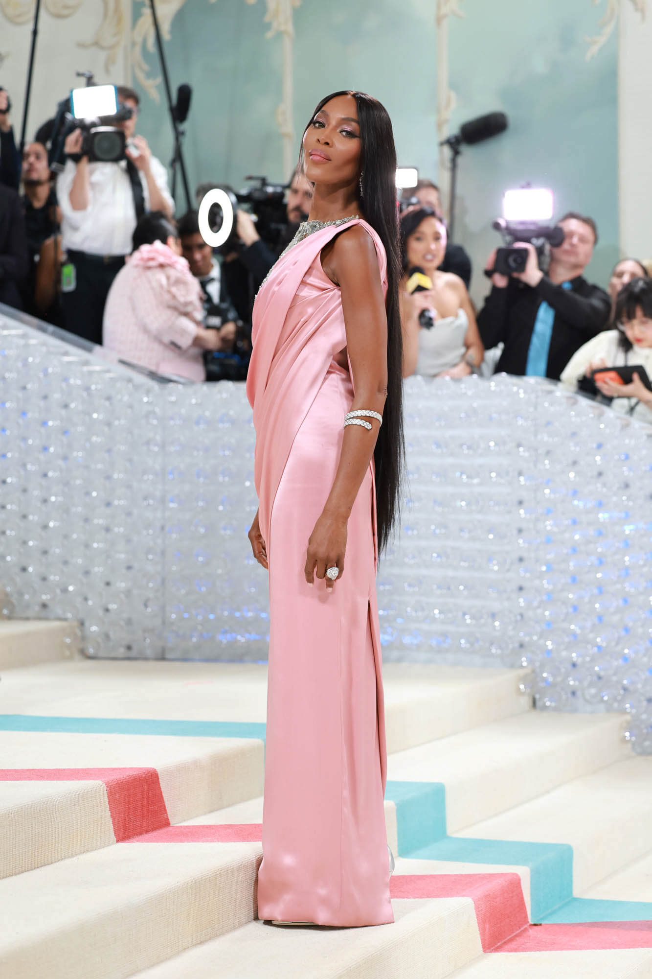 Naomi Campbell rocked a pink goddess gown, and staying with the supermodels, Kate Moss and her daughter, Lila, both wore blush pink Fendi gowns. Kate opted for a sheer cape, while Lila’s dress is feathered, another nod to one of Uncle Karl’s favorite embellishments.