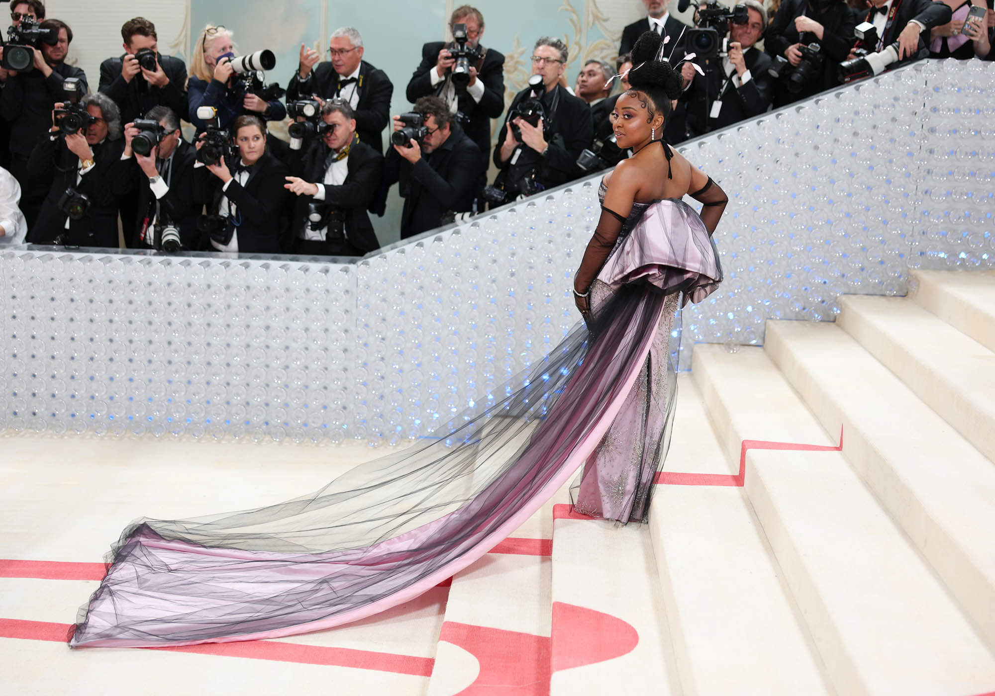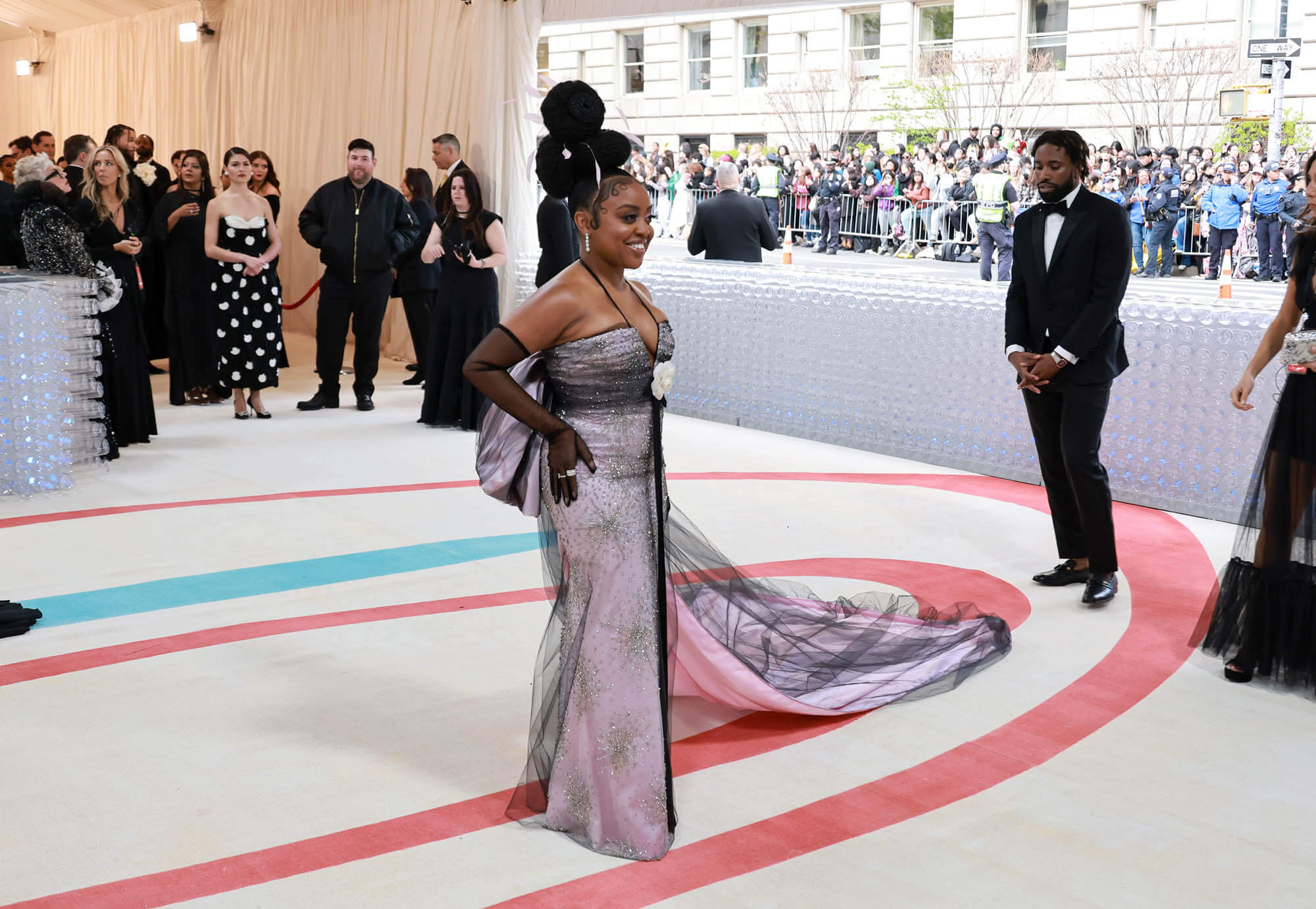 And then there are Quinta Brunson (also in Prabal Gurung) and Sydney Sweeney (in Miu Miu). It’s not that I disklike either of these looks. I’m into Quinta’s entire look—sheer gloves again! THE HAIR!—and Sydney’s is fine. She doesn’t need the knee hobble, but I actually don’t hate the effect of the black line around her legs and in her hair. The twee factor is balanced by the dress not working too hard elsewhere. It’s just a blush/nude pink with crystal embellishments. There’s no poof or fluff or gloves or big jewelry. The black embellishments are doing all the work.