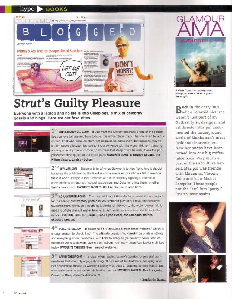 Huge smutty thanks to Ian for sending along this scan from Canada"s Strut Magazine where my site is given an official endorsement! To be mentioned in the same list as Pink, Gawker, Fug, and Defamer??? I can"t think of a better way to kick off the weekend! Thank you, love you, owe you!