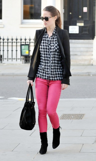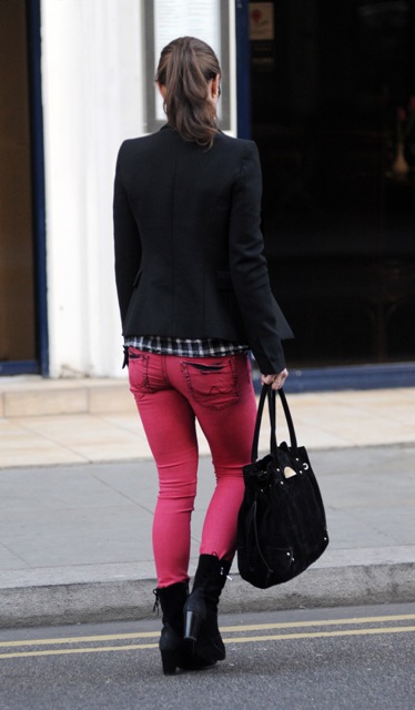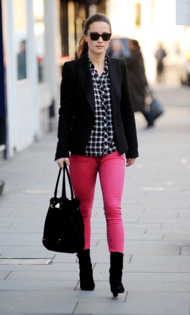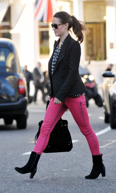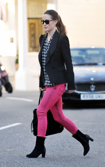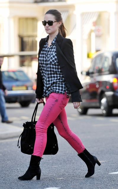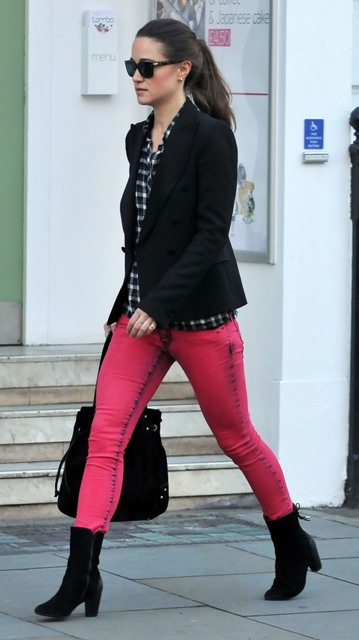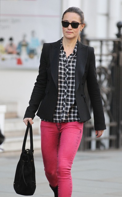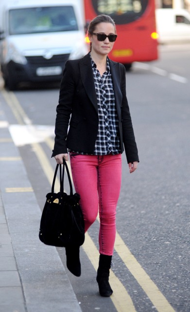 Pippa Middleton was the Great Disappointment of 2011. So much promise, and totally no delivery. Pippa can't even dress properly casually. This little combination here with the plaid and the blazer and the jeans and the suede boots with the really lame heel...