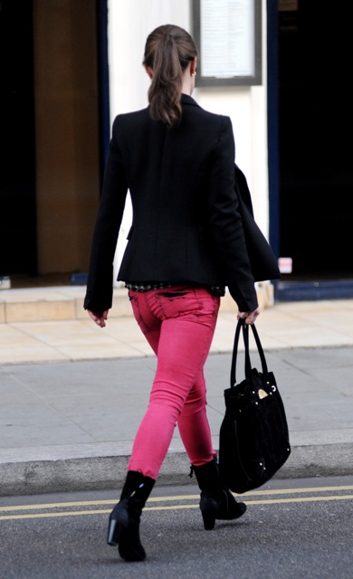 I know they're not exactly red. But it's not the exact shade I find so offensive. Never mind the tacky bleeding down the side seam either. Mostly it's the way she's wearing them.