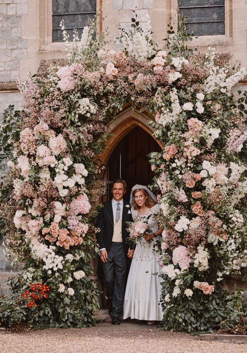 All of this is gorgeous. I love that shot of them coming out of the chapel with all that blush pink colouring framing the archway. It’s fresh and lush and goes so beautifully with his waistcoat and her skin and hair and…you know what kills me? The colour scheme of Beatrice’s wedding goes perfectly with this!