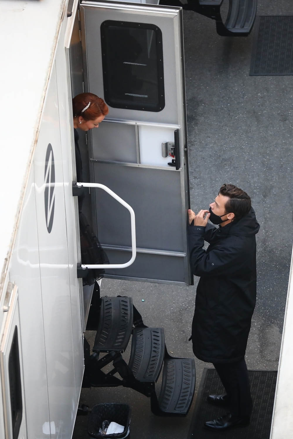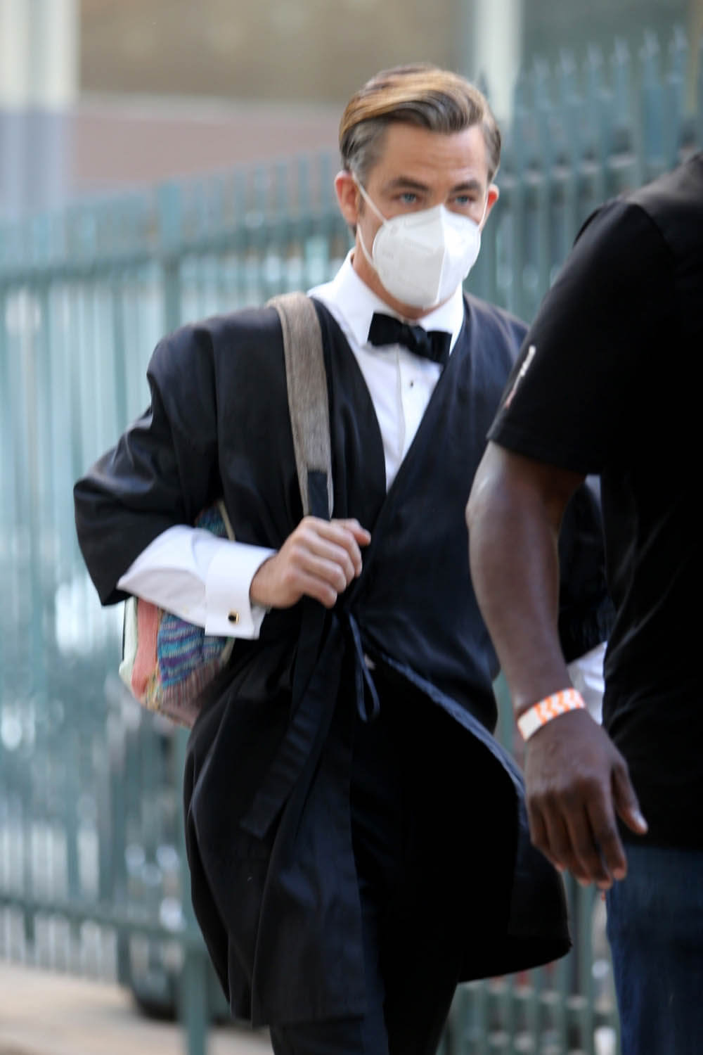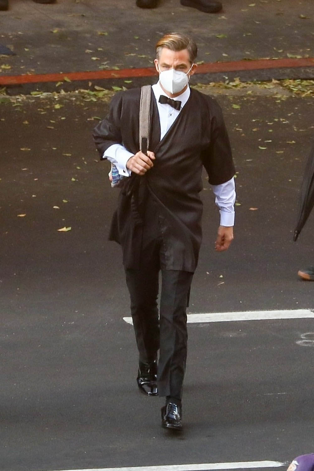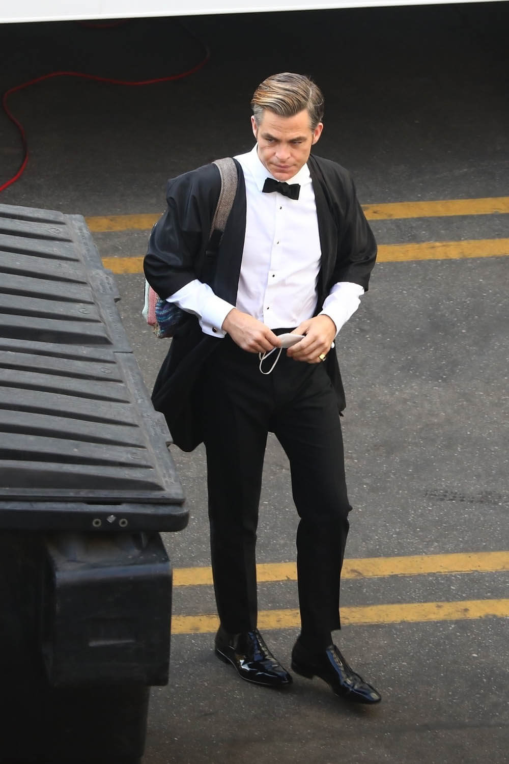 Nope. Not going there. Let’s stay with self-caring through Chris Pine and these shots of him on the set of Don’t Worry Darling (or Don’t Worry, Darling) yesterday. Olivia Wilde, Harry Styles, and Dita Von Teese were also seen prepping for what was evidently a ball or gala. The film is about a housewife in the 1950s living in an affluent community and … some sh-t goes sideways. Chris fits right into that whole look. Also this is why Harry Styles cut his hair.