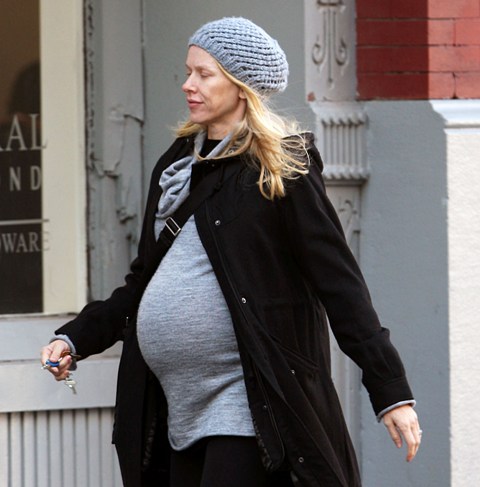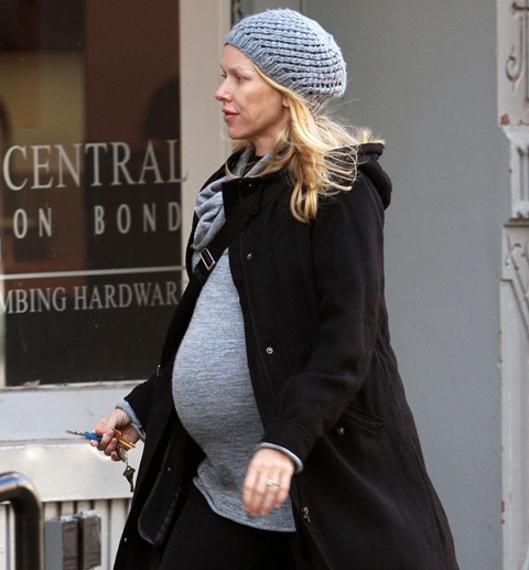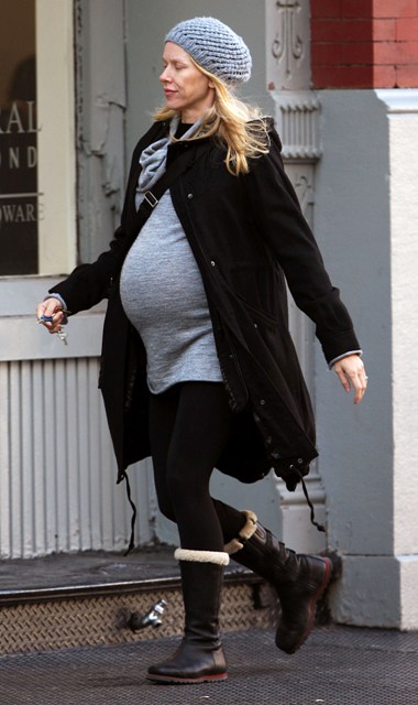 How’s this for un-taupe pregnancy style? Naomi Watts, who seems like she’s been pregnant forever, in New York yesterday looking like she’s pretty ready.