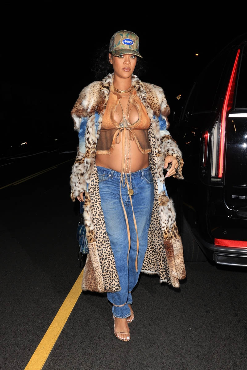 Rihanna hit up her favourite restaurant, Giorgio Baldi. The fit was animal print and denim, a tiny top from the pre-maternity Rihanna era, and the highlight for me: not the bump but what she’s done with the straps on her sandals, wrapping them over her jeans to create a taper and a cuff so that they’re now shaped like a jogger. I love this fashion hack.