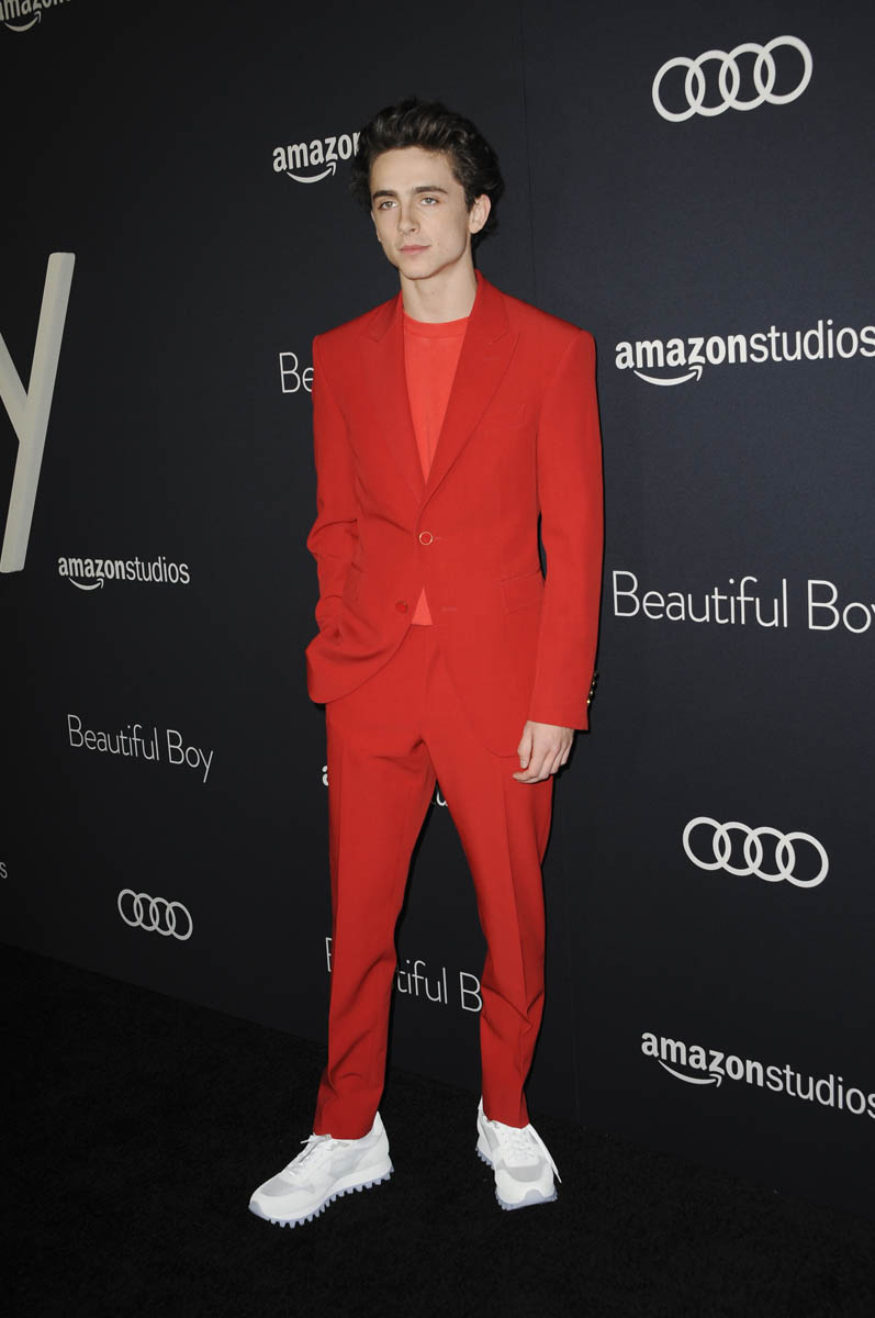 Goddamn Timothee Chalamet is pretty. Look at that bone structure. It’s just… such a pretty face. Also I love him in this red suit. Louis Vuitton, styled similarly to how it was sent down the runway, with just a plain red t-shirt underneath but with crisp, sharp white sneakers instead of boots. Which probably you can only get away with if you’re Timmy Chalamet, all of 22 years old. Like, my dad kinda dresses like this, the way he wears his pants, with senior citizen footwear, and it’s definitely not the same effect.