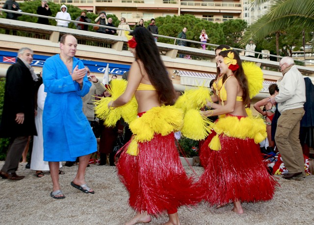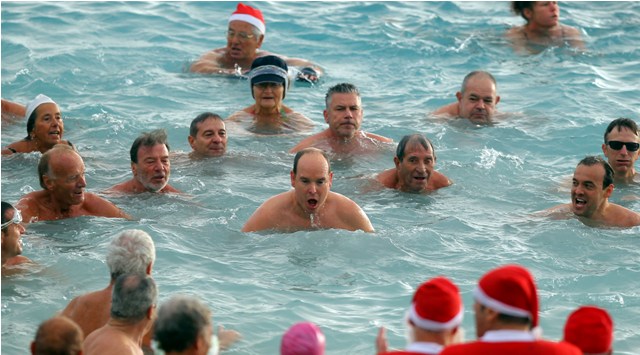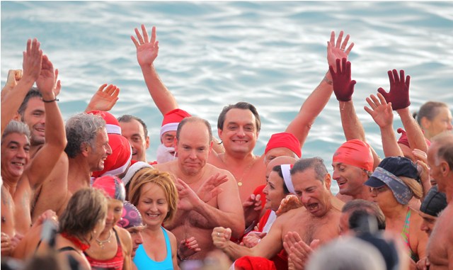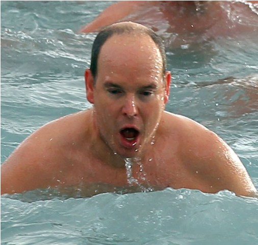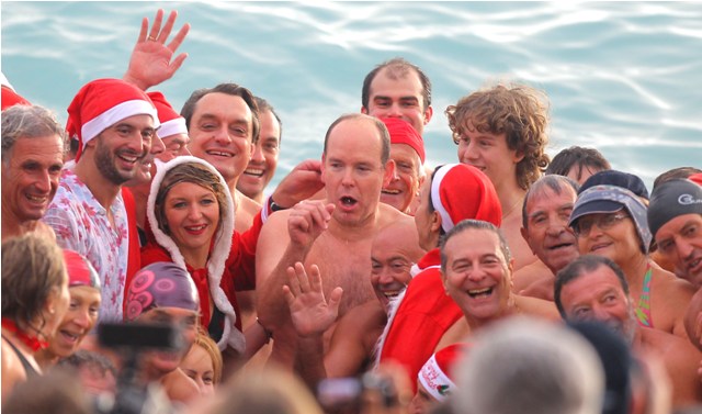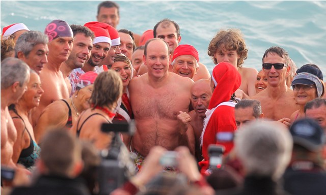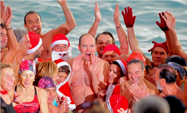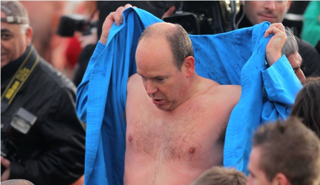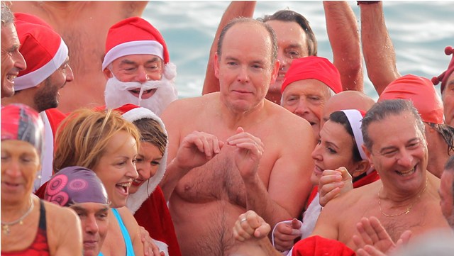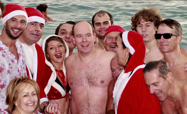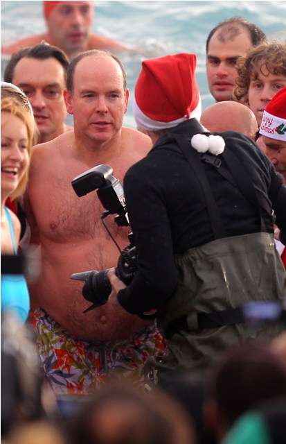 This is Monaco’s Prince Albert participating in the traditional Christmas bath yesterday in, I guess?, royal swimwear?